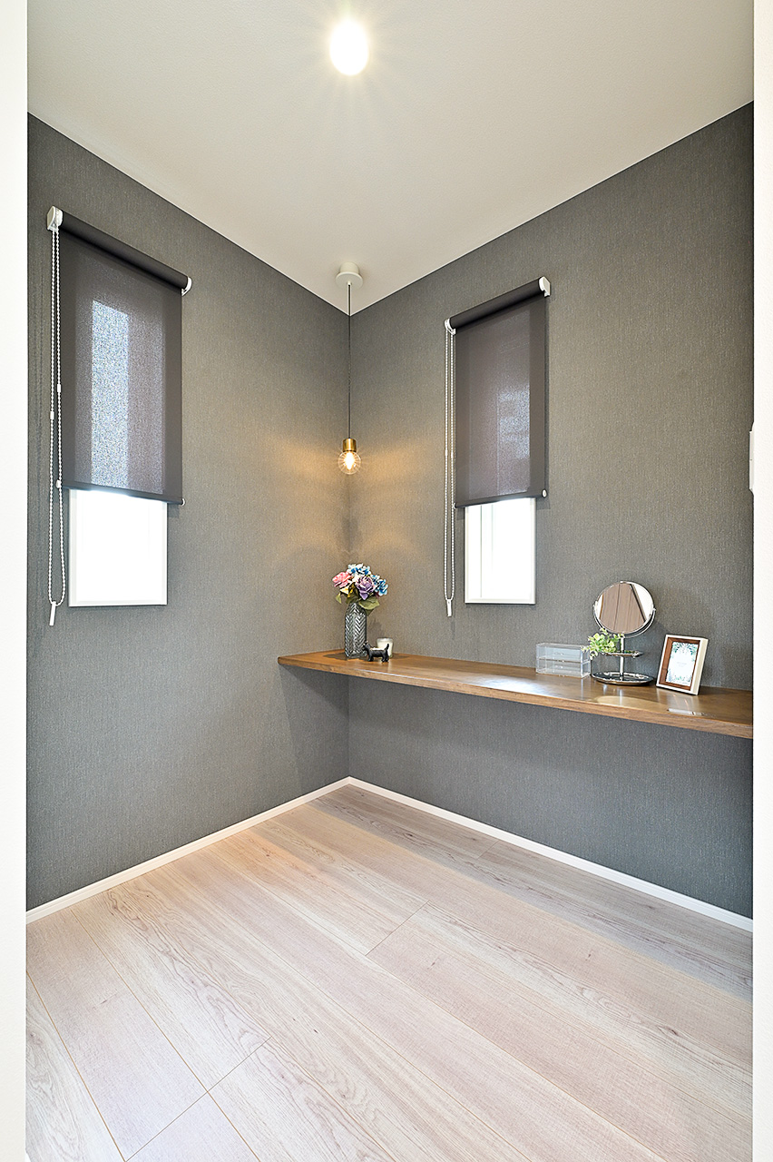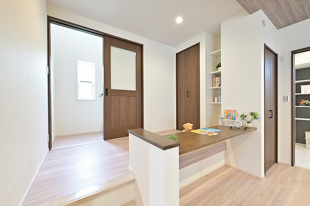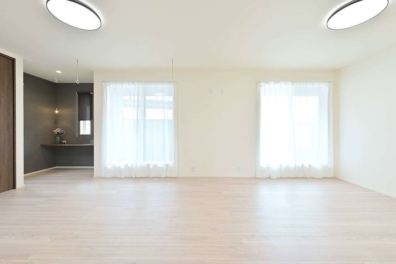 木目調のクロス、ホワイトアッシュで統一したフロアの素材感が空間にぬくもりと落ち着いた雰囲気を表現。