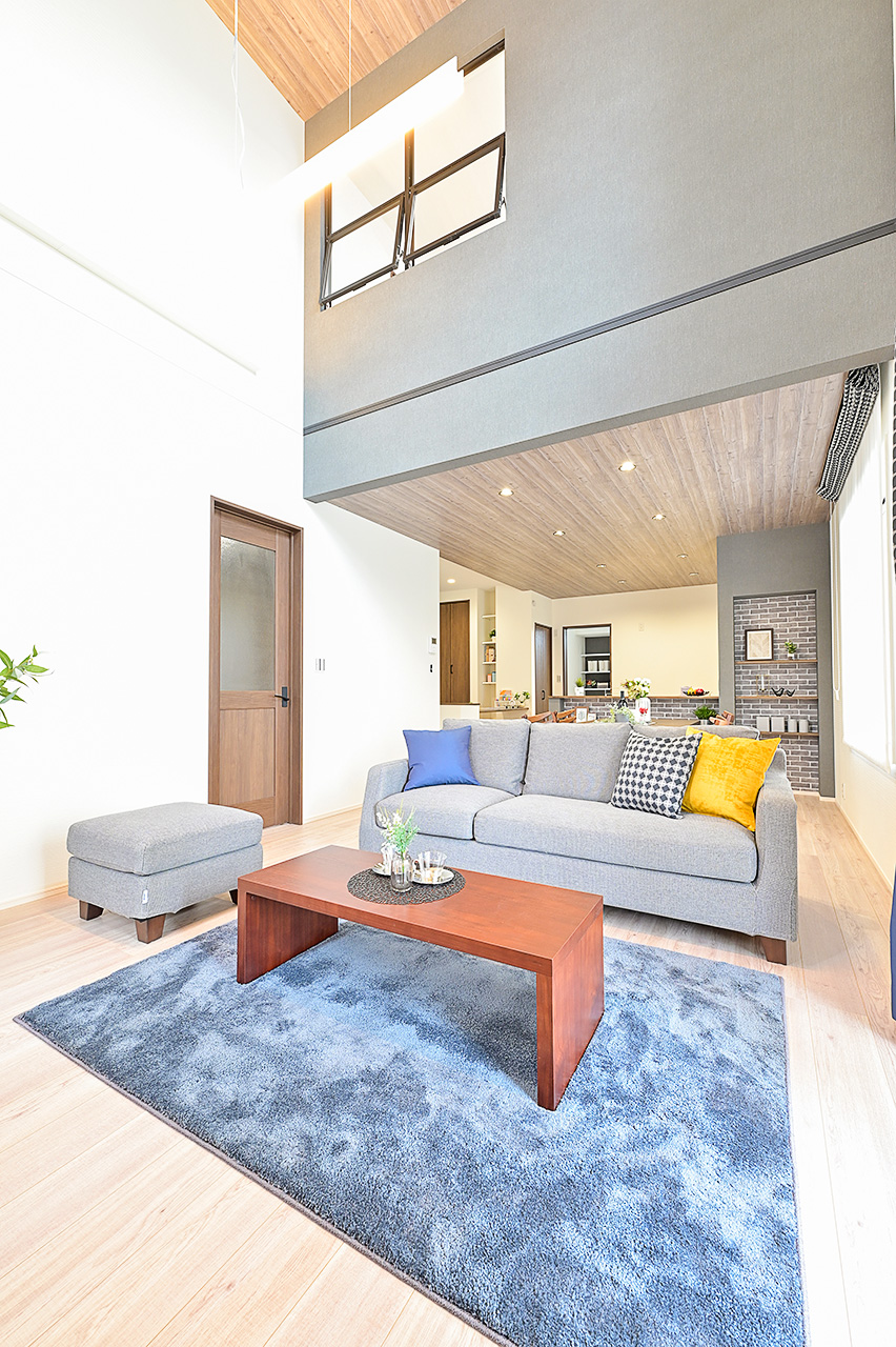1階・2階の窓から太陽の光をたっぷり導く吹抜天井のリビング。