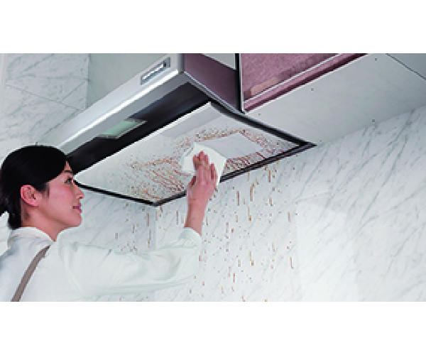 整流板がフードの外に逃げようとする煙をキャッチ。臭いや汚れのもとになる油煙を確実に捕集します。