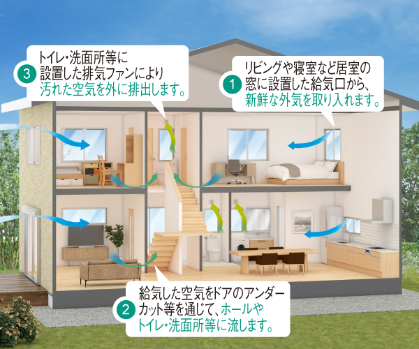 24時間、機械的に換気を行い(0.5回/h※)、室内の空気を新鮮な外気と入れ替え。さらに湿気やカビを発生しにくくし、クリーンで快適な空気環境をつくり出しています。※1時間あたり部屋の空気を半分換気することです。