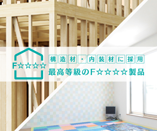 構造材の接着剤、天井裏等に使われる下地材や断熱材、内装クロスなどにJASまたはJIS規格で認定されたホルムアルデヒドの放散量が最も少ないF☆☆☆☆製品を採用しています。