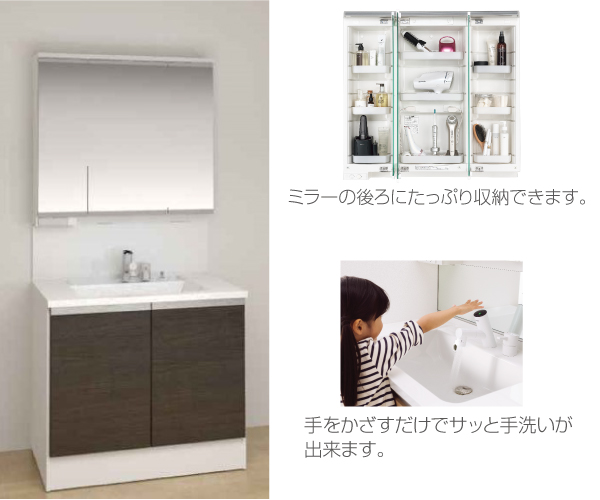 900mm幅の洗面化粧台なので広く使え、毎日の作業もグンと楽になります。ゆとりの収納力でサニタリールームをすっきりと演出します。