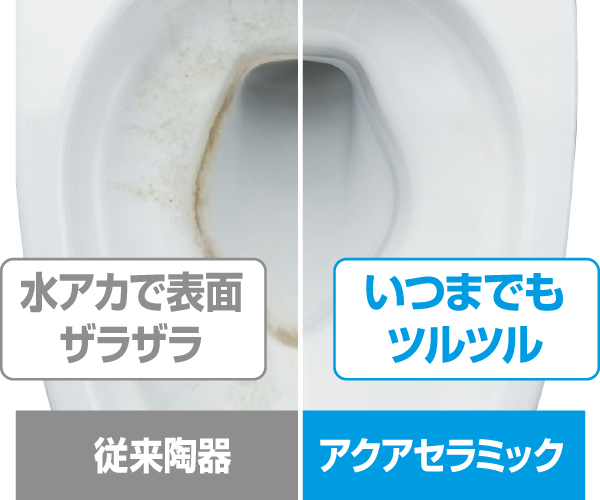 従来の陶器ではできなかった「ガンコな水アカ」も「汚れ」もどちらも落とせる、お掃除ラクラクな衛生陶器です。