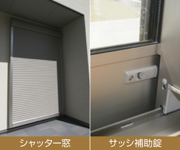 リビングなどの大きな引き違い窓にはシャッターやロック機構付のクレセント錠、さらにサッシ下部にもサブロック機能を標準装備しています。