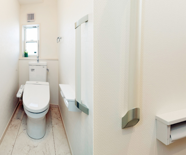 座る・立つといった動作が足腰への大きな負担をかけるトイレ。握りやすい位置に手すりを設置して、負担の軽減に配慮しています。