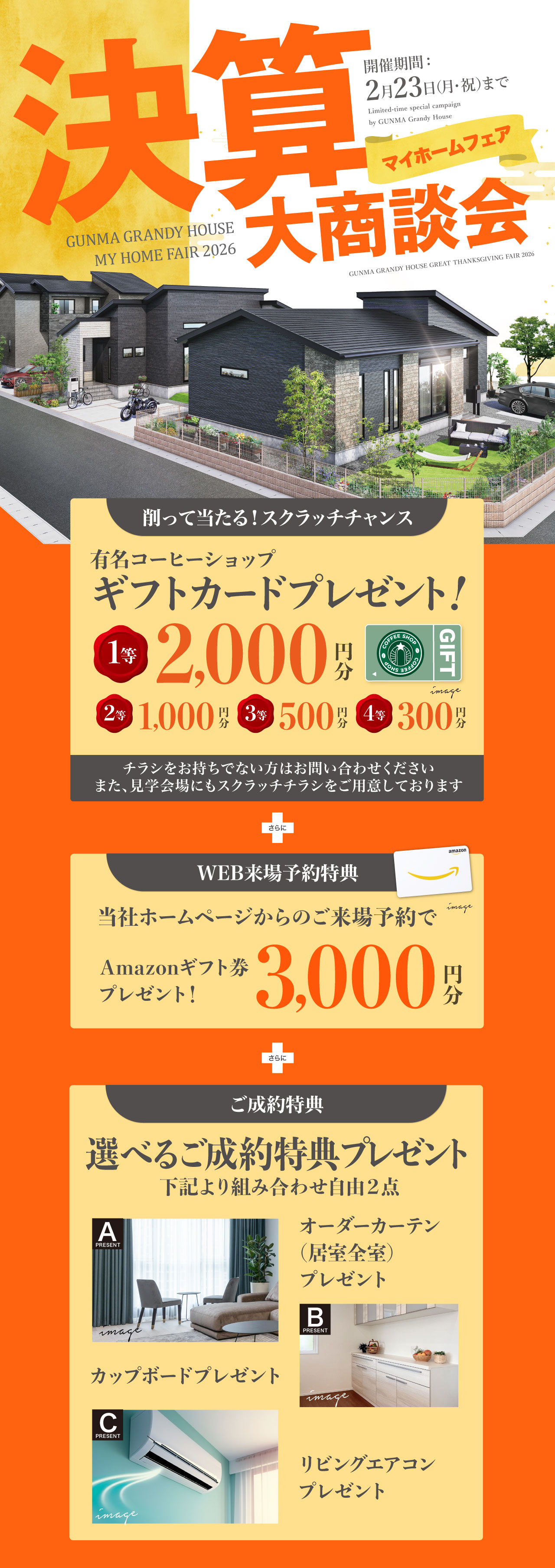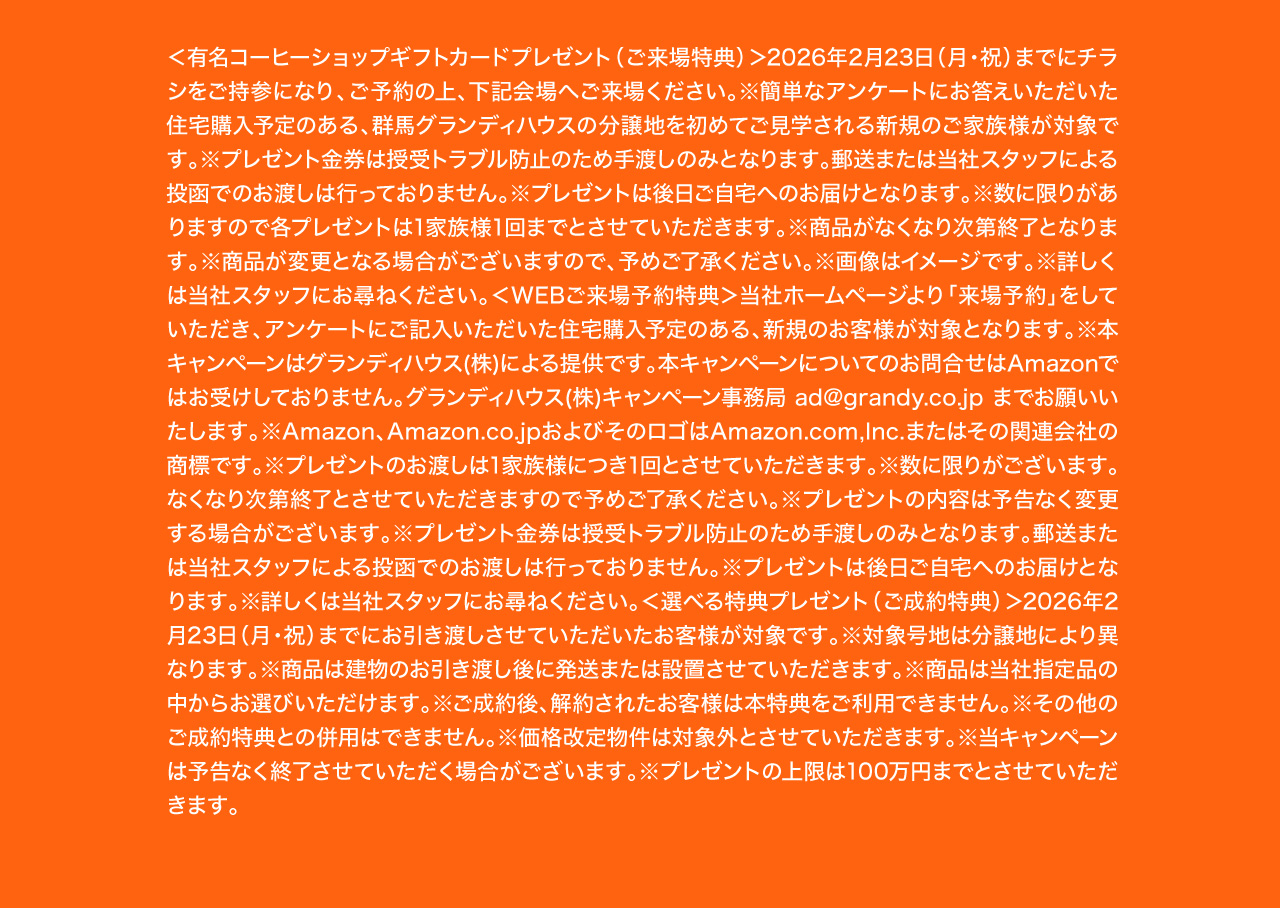 決算大商談会|群馬グランディハウス グランディハウスの分譲住宅&モデルハウスをご紹介。多彩な立地・間取りプラン・デザインなどの中から比較検討いただきぜひ、実際の街や住まいを訪れて暮らし心地を確かめてください。 グランディハウスのショールームをご紹介。家が建ってからでは見ることのできない構造や安全性を確認できます。また、最新の物件情報の閲覧など、新しい暮らしの第一歩を。