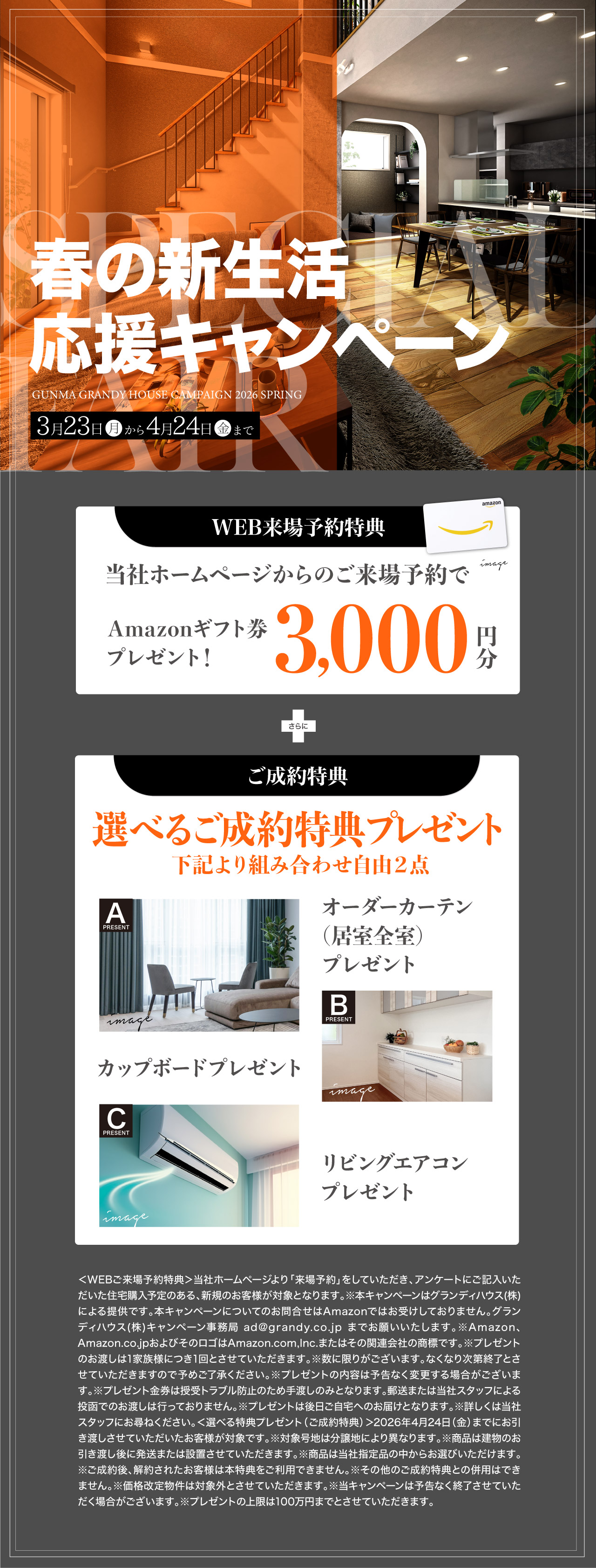 春の新生活応援キャンペーン|群馬グランディハウス グランディハウスの分譲住宅&モデルハウスをご紹介。多彩な立地・間取りプラン・デザインなどの中から比較検討いただきぜひ、実際の街や住まいを訪れて暮らし心地を確かめてください。 グランディハウスのショールームをご紹介。家が建ってからでは見ることのできない構造や安全性を確認できます。また、最新の物件情報の閲覧など、新しい暮らしの第一歩を。