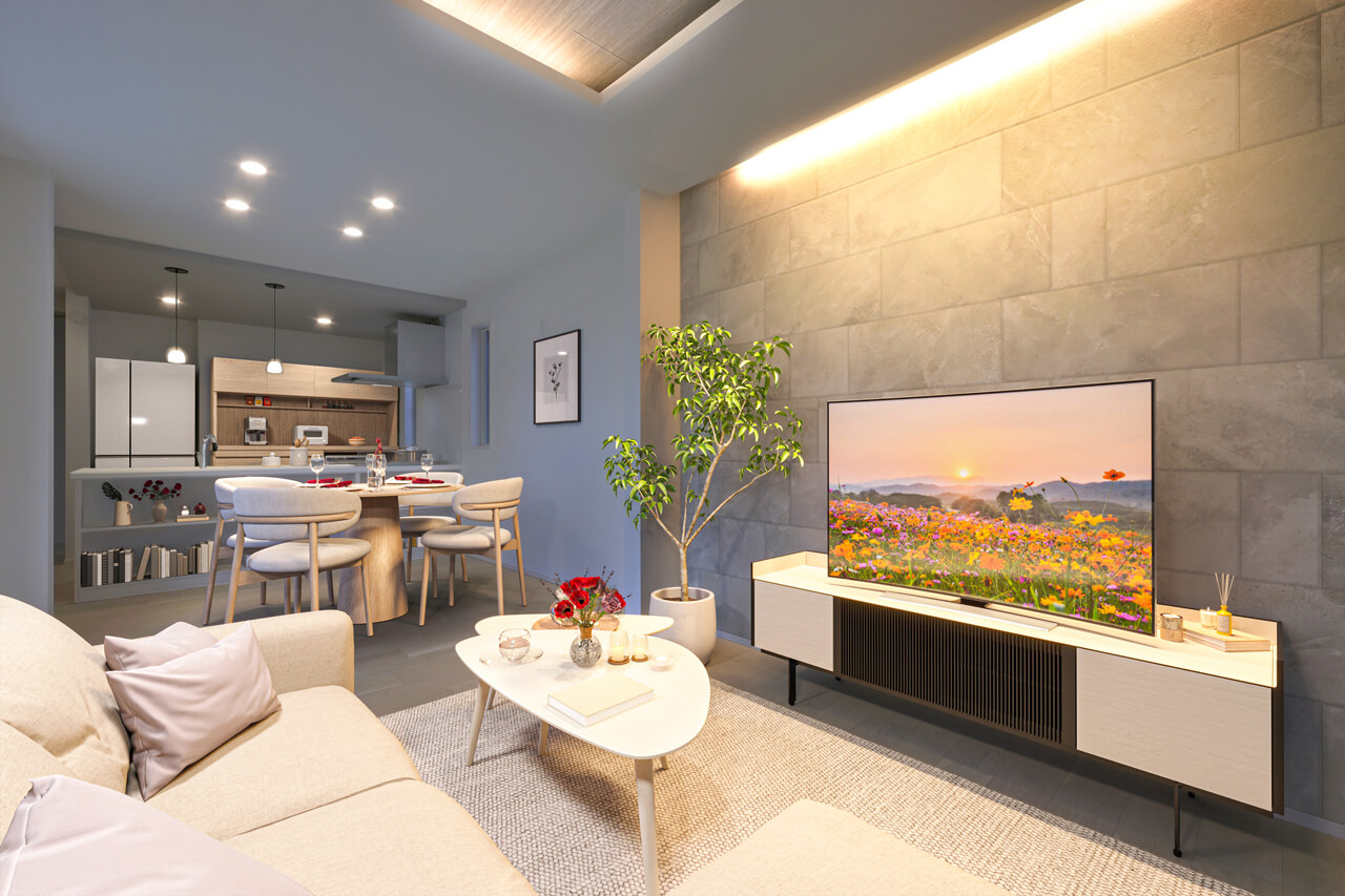 LDK空間の広さをより実感できるオープンキッチン。開放的で目線を遮るものがなくコミュニケーションが取りやすいため、料理をしながらの会話も弾み、お手伝いにも気軽に参加できます。