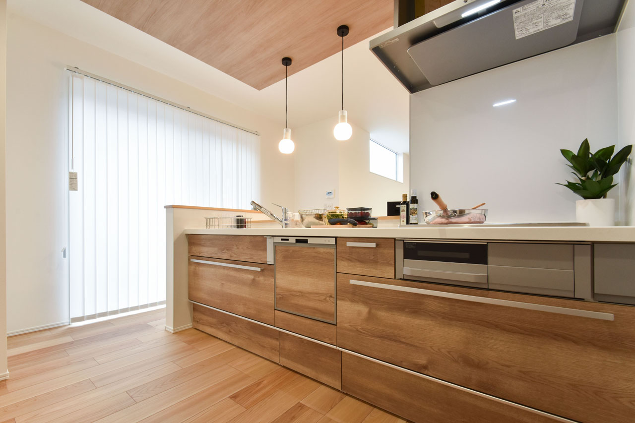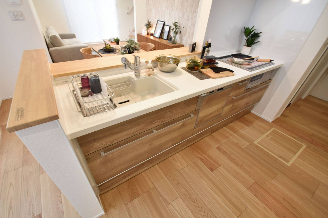 家族でのコミュニケーションがとれる対面型システムキッチンです。横一列にシンクとコンロをまとめたシンプルな形です。動きやすさとスタイリッシュなデザインが魅力です。