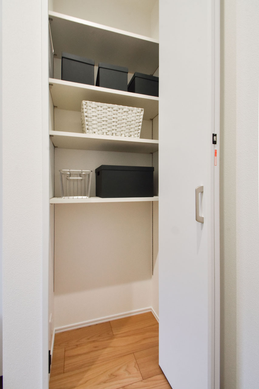 ご夫婦の衣類をたっぷり整頓できる大容量のウォークインクローゼットと、季節の家電や家具など大きな物も仕舞える納戸がひとつになった収納空間。使い勝手のいい主寝室とホールの両方から出入りできる2WAYタイプです。