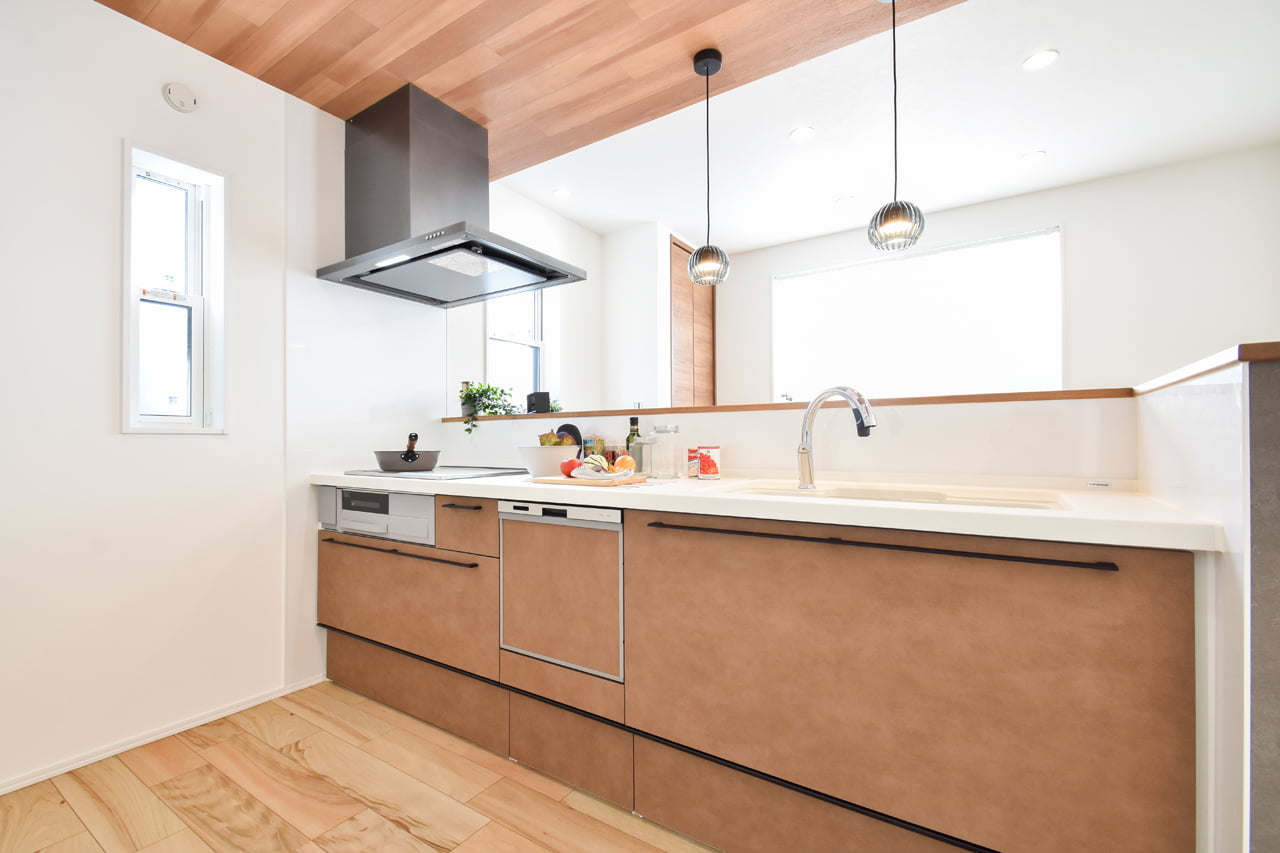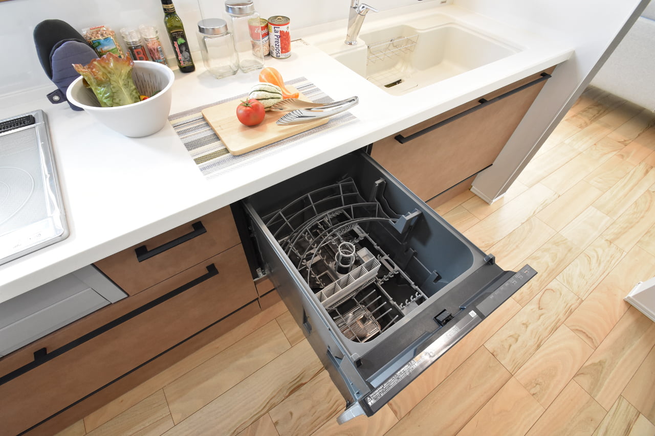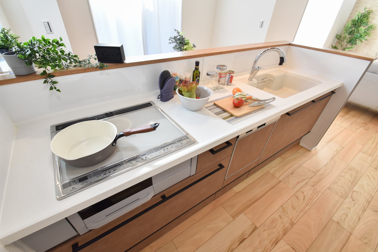 システムキッチンのすぐそばに配置したパントリー。ストック食品や調味料やお酒のほか、非常食や水のペットボトルなどの防災用品も収納できます。キッチンからすぐ手が届く場所にあるから、整理整頓もテキパキできて、キッチン空間をスッキリ保てます。
