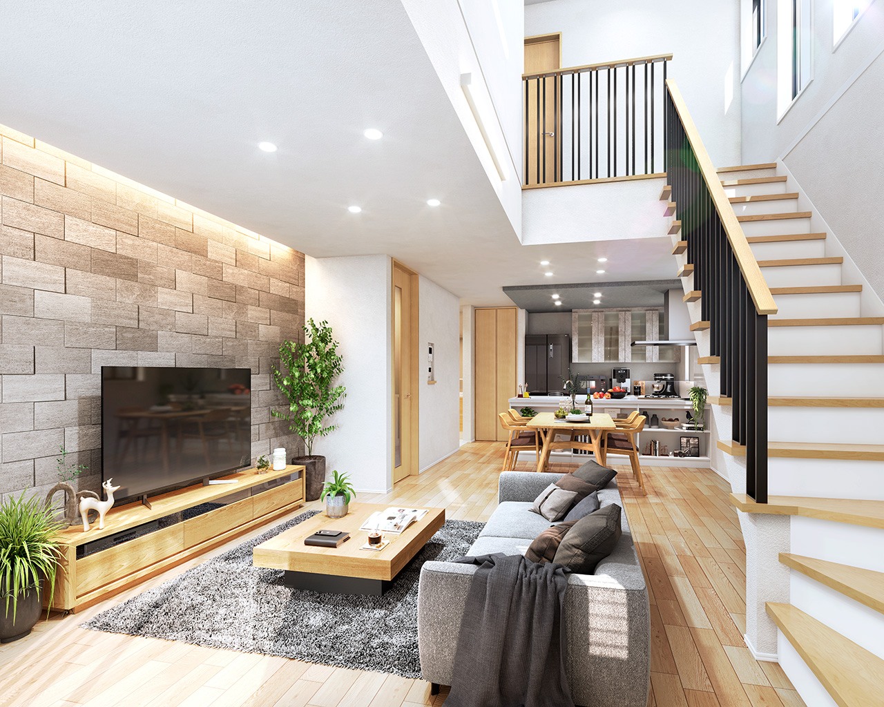 2階へ向かう際に、自然とリビングを通るよう設計された「リビング階段」。みんなが集まる広場へ続く階段のように、2階のプライベートな空間とパブリックなLDKを程よい距離感で結び、親子のコミュニケーションを自然と深めてくれます。
