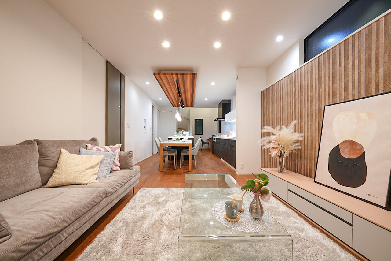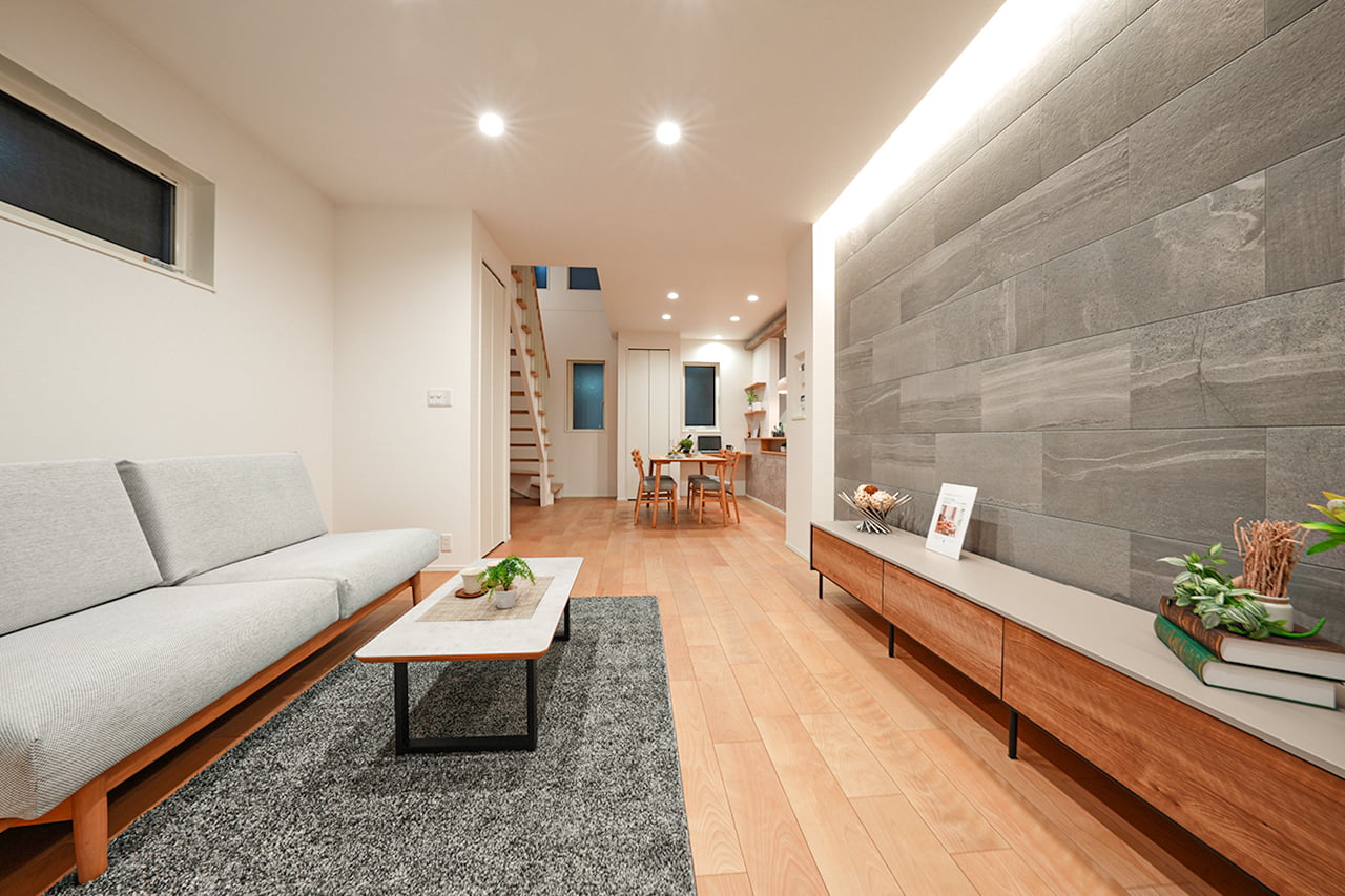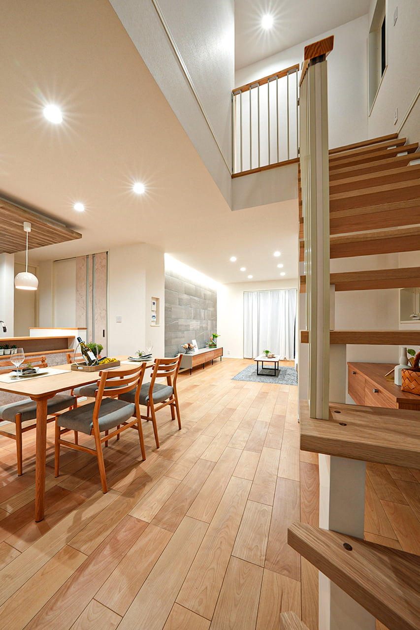 リビングという暮らしのメインスペースは、一日で家族が一番長く過ごす場所。その居心地をさらに高めるために18帖以上のワイドな広さを確保しました。広場のようなパブリックスペースがご家族の集いや団らんを心地よく育みます。