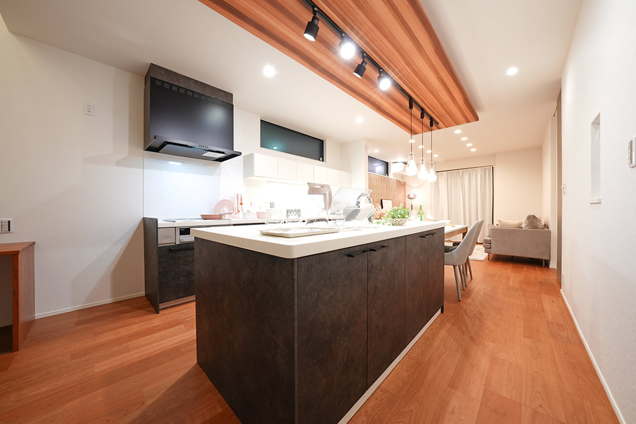 家族でのコミュニケーションがとれる対面型システムキッチンです。横一列にシンクとコンロをまとめたシンプルな形です。動きやすさとスタイリッシュなデザインが魅力です。