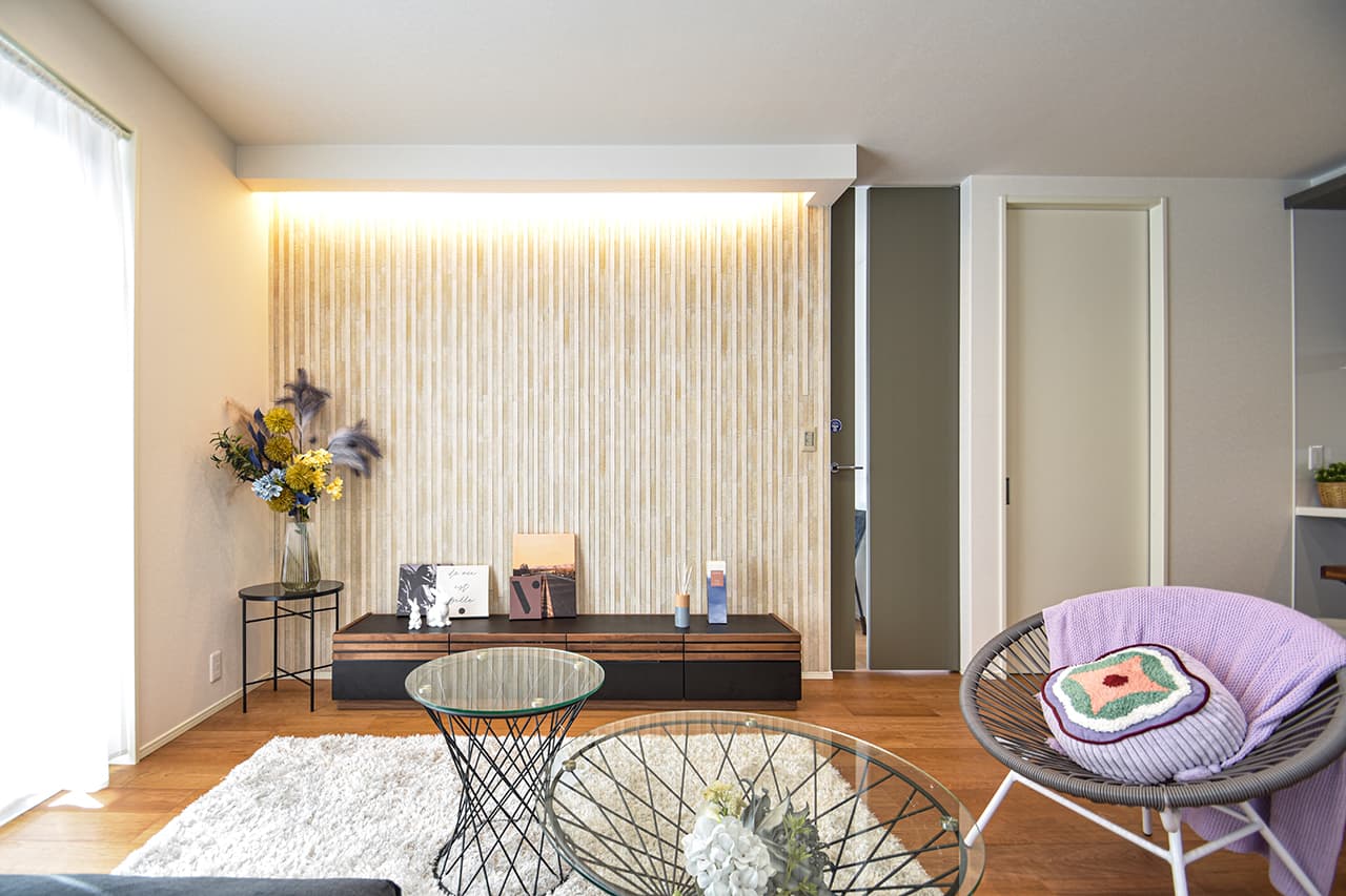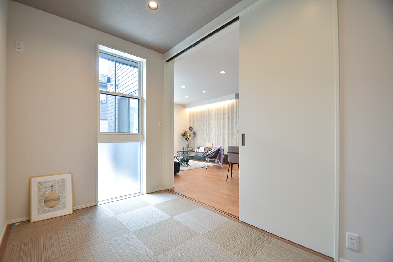 肌触りが心地いいテキスタイルをフロアに採用したリビングそばの寛ぎ空間。テキスタイルは、クッション性が高く子ども達の遊び場にもピッタリ。低い目線のロースタイルでリラックスタイムを深めたり、友人や仲間たちをおもてなしする、スタイリッシュな和モダン空間にアレンジしたり。スタイルや表現したい事で、使い方が多彩に広がる空間です。