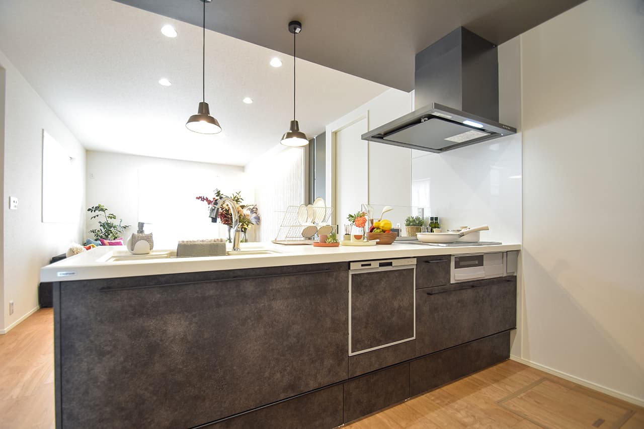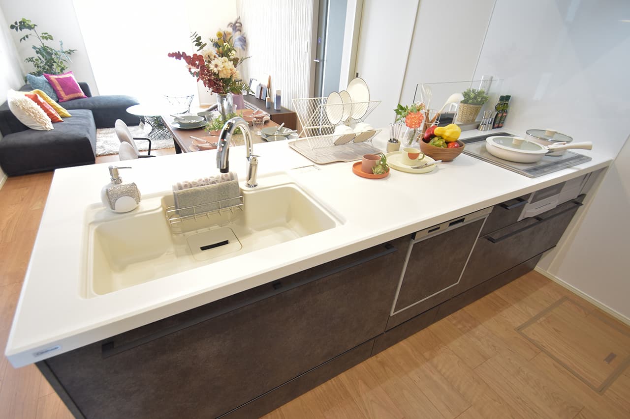 LDK空間の広さをより実感できるオープンキッチン。開放的で目線を遮るものがなくコミュニケーションが取りやすいため、料理をしながらの会話も弾み、お手伝いにも気軽に参加できます。