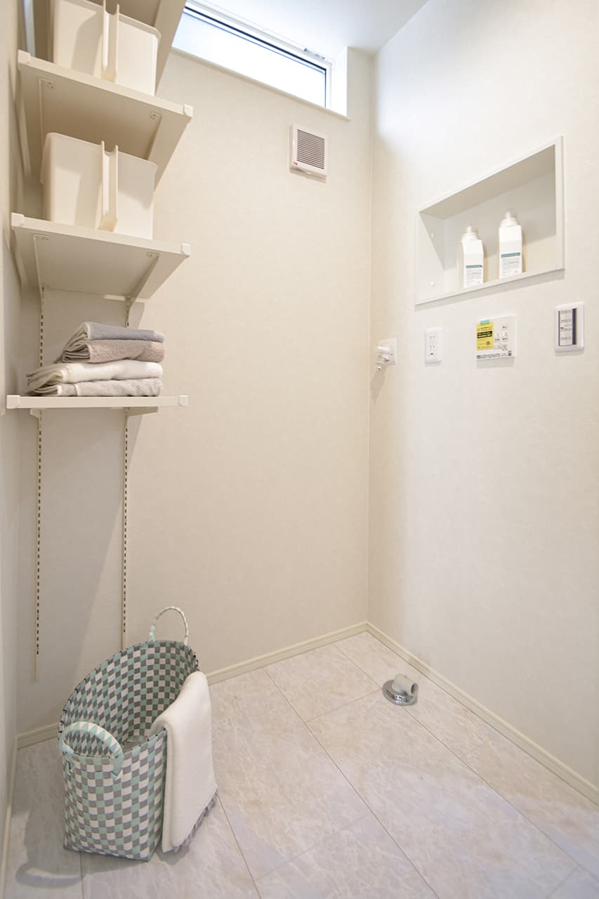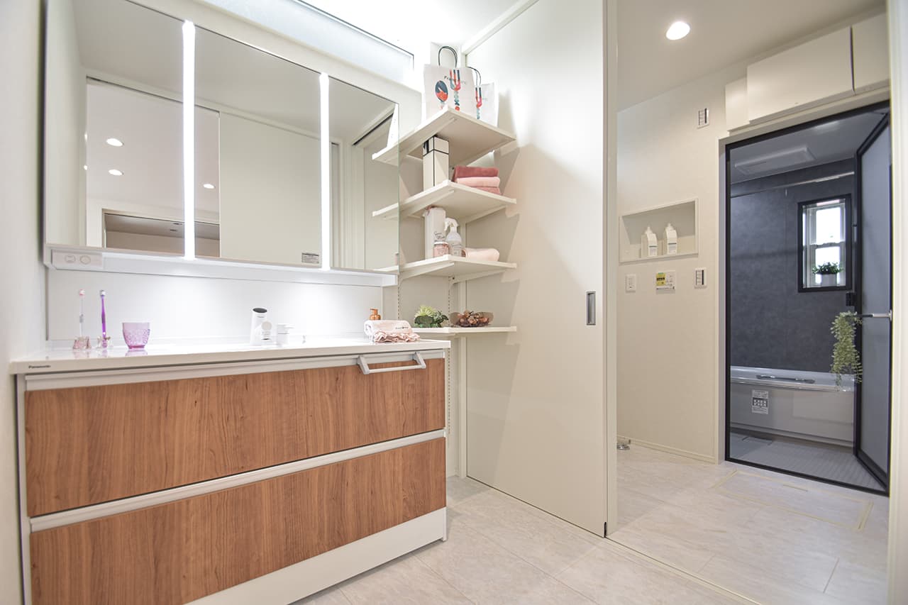 脱衣所と洗面所スペースをセパレートした独立洗面台。来客時など、あまり見せたくない洗濯機まわりを気にする事なく、洗面所を利用することができます。