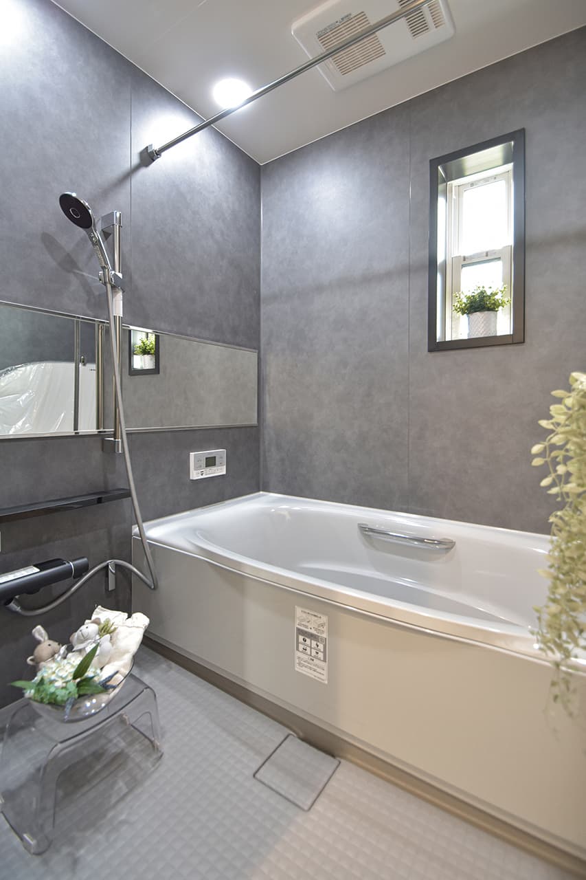 全面に採用したシックな壁面パネルと、スタイリッシュなワイドミラーやダウンライトが上質なバスタイムを演出します。