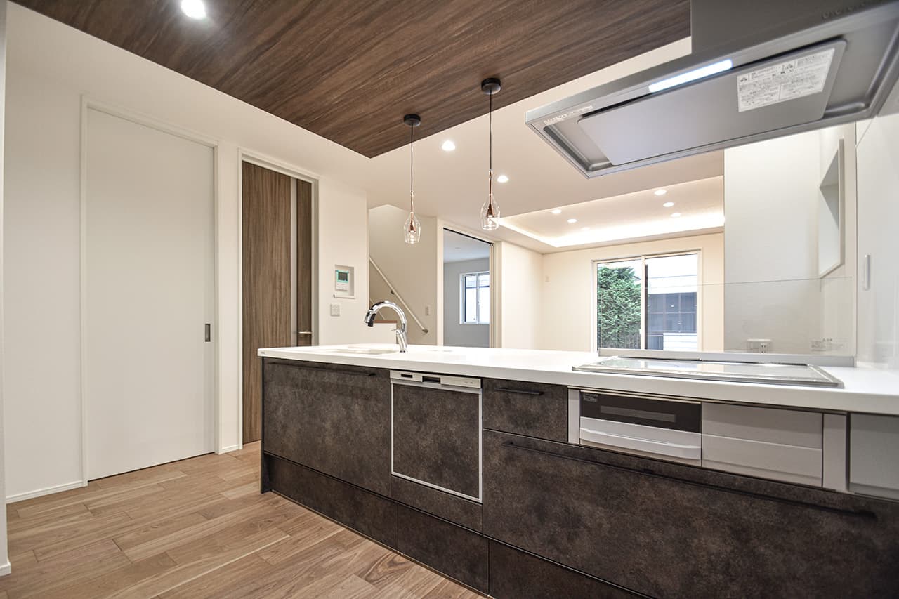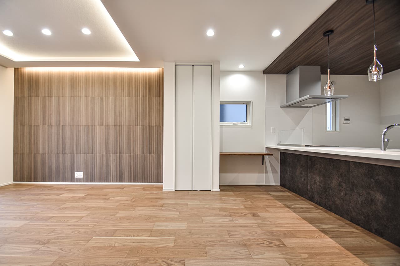 LDKにレイアウトしたカウンタースペース。子ども達の学習スペースやパパのSOHOスペース、ママのワーキングスペースなど、用途やスタイルに応じて多彩に活躍。家族のそばでみんなが利用できるライブラリー空間です。