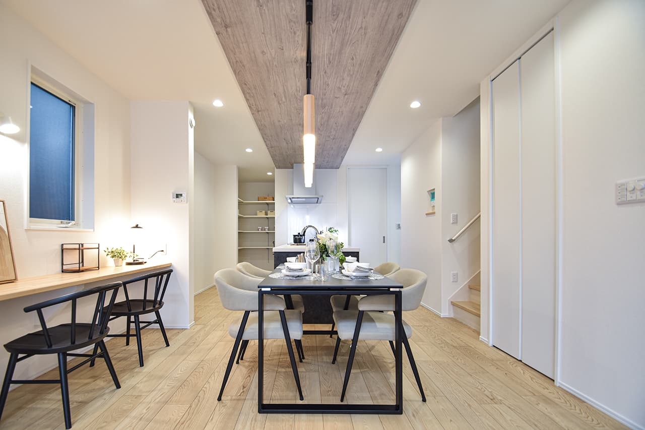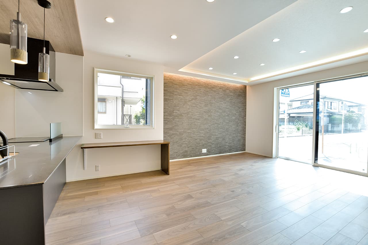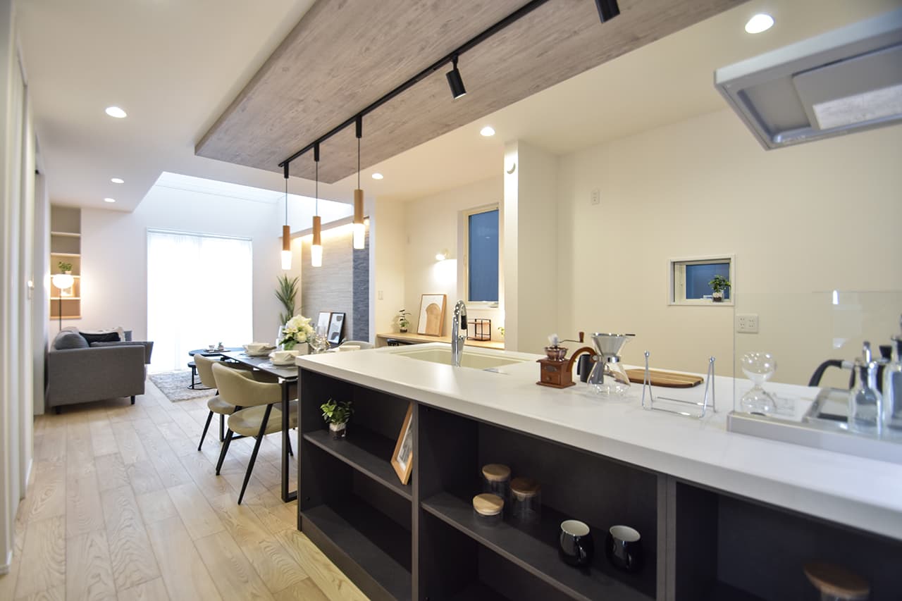 LDK空間の広さをより実感できるオープンキッチン。開放的で目線を遮るものがなくコミュニケーションが取りやすいため、料理をしながらの会話も弾み、お手伝いにも気軽に参加できます。