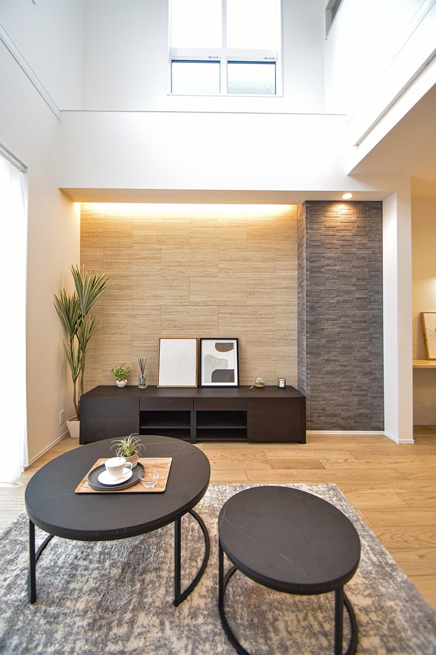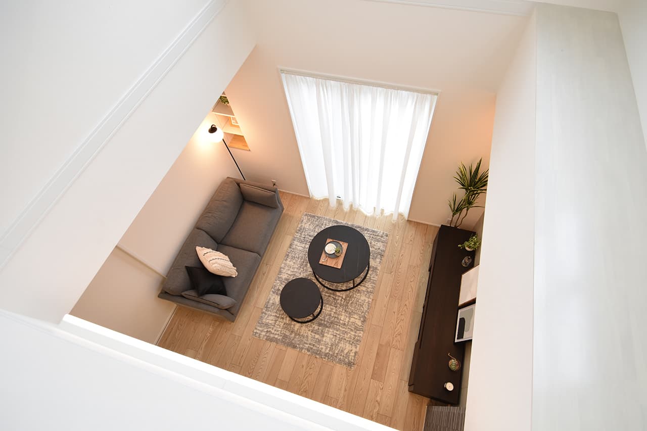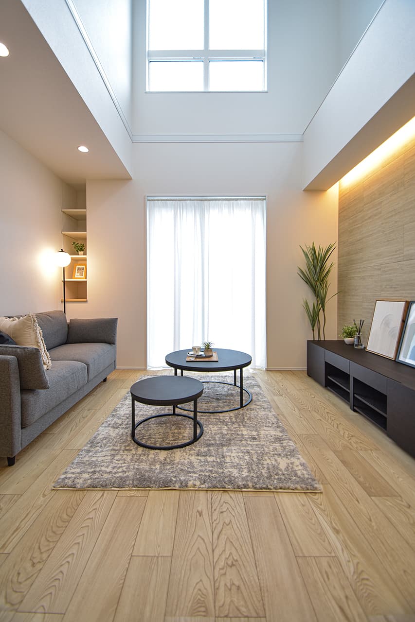 ご家族の団らんや寛ぎの中心となるリビング空間をさらに際立たせる吹抜け天井プラン。2階天井まで続くその圧倒的な存在感と広がりが訪れた方を驚きを持ってお迎えします。大切にしたいご家族やゲストをもてなす上質な空間です。