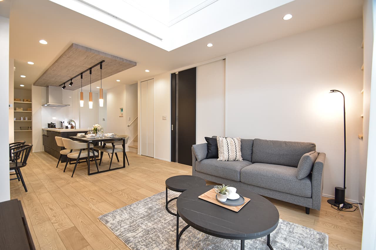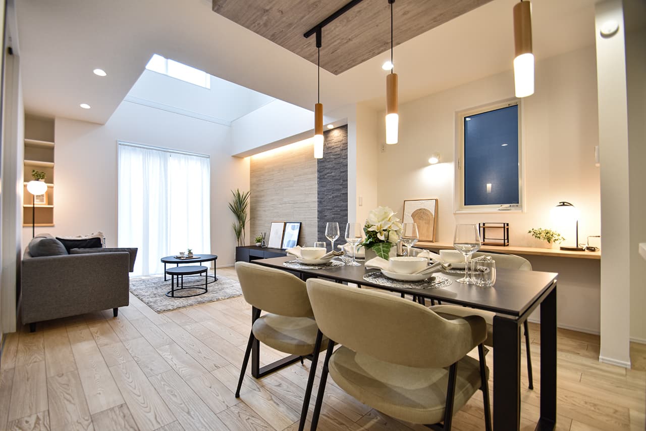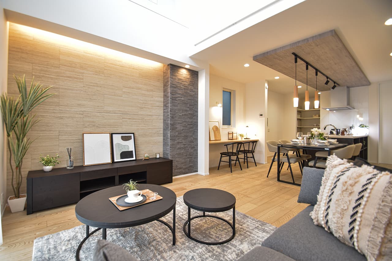 ご家族の団らんや寛ぎの中心となるリビング空間をさらに際立たせる吹抜け天井プラン。2階天井まで続くその圧倒的な存在感と広がりが訪れた方を驚きを持ってお迎えします。大切にしたいご家族やゲストをもてなす上質な空間です。