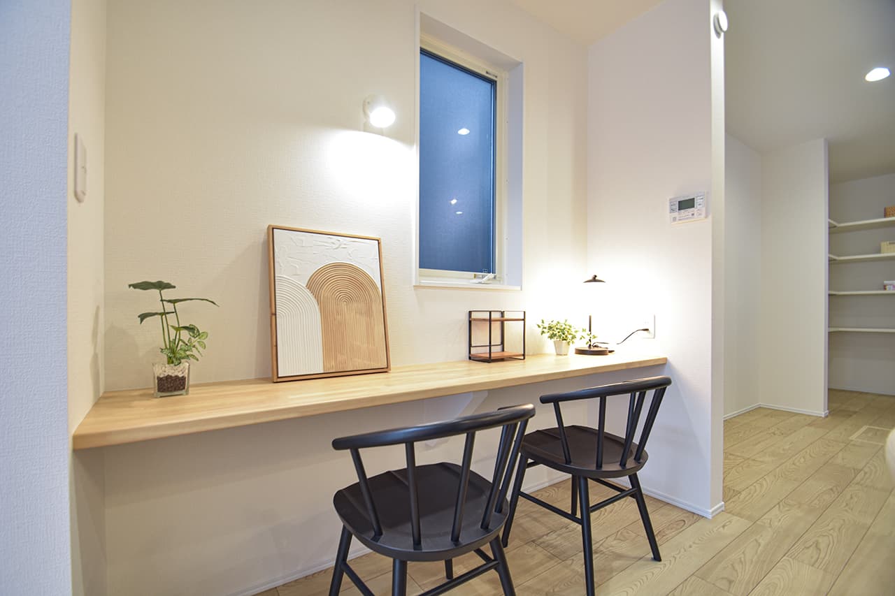 LDKにレイアウトしたカウンタースペース。子ども達の学習スペースやパパのSOHOスペース、ママのワーキングスペースなど、用途やスタイルに応じて多彩に活躍。家族のそばでみんなが利用できるライブラリー空間です。