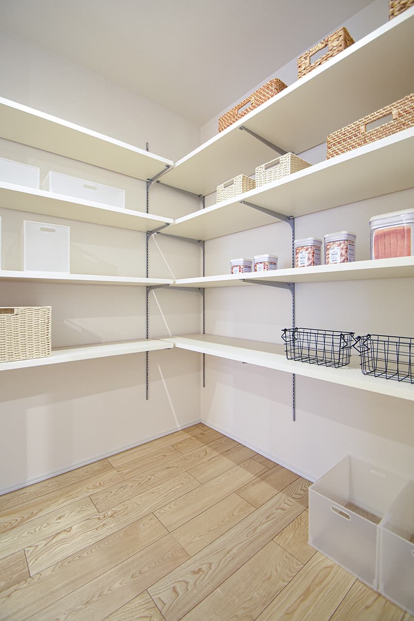 システムキッチンのすぐそばに配置したパントリー。ストック食品や調味料やお酒のほか、非常食や水のペットボトルなどの防災用品も収納できます。キッチンからすぐ手が届く場所にあるから、整理整頓もテキパキできて、キッチン空間をスッキリ保てます。