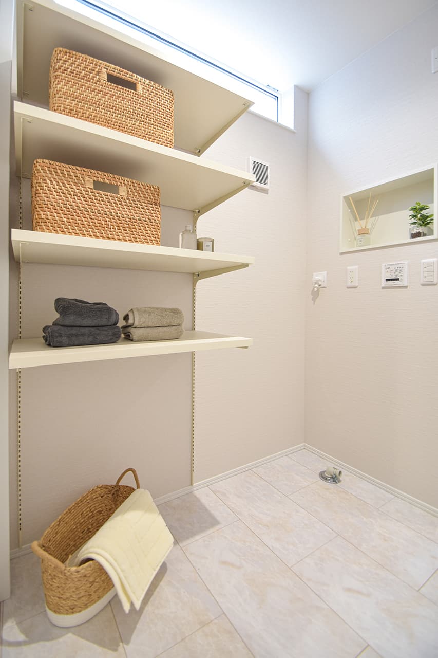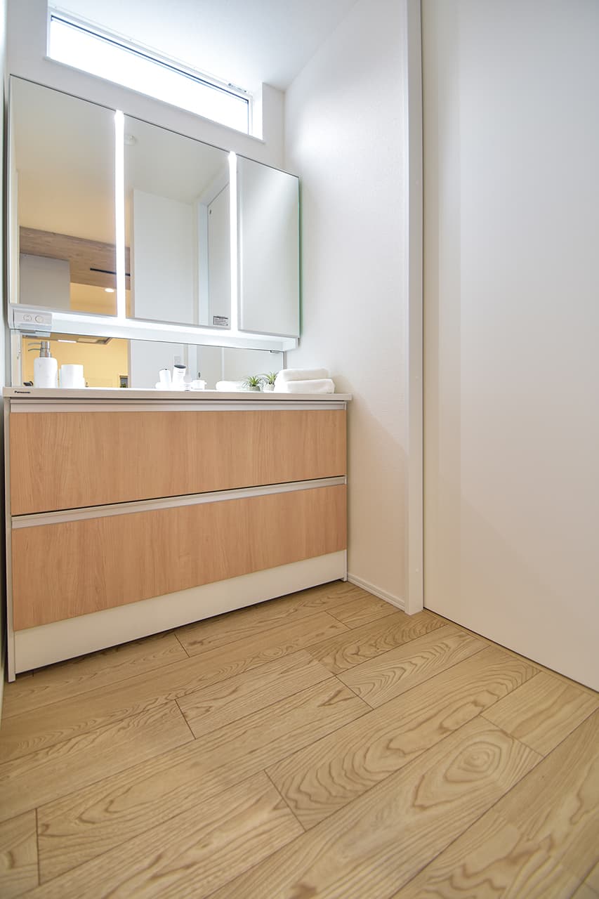 脱衣所と洗面所スペースをセパレートした独立洗面台。来客時など、あまり見せたくない洗濯機まわりを気にする事なく、洗面所を利用することができます。