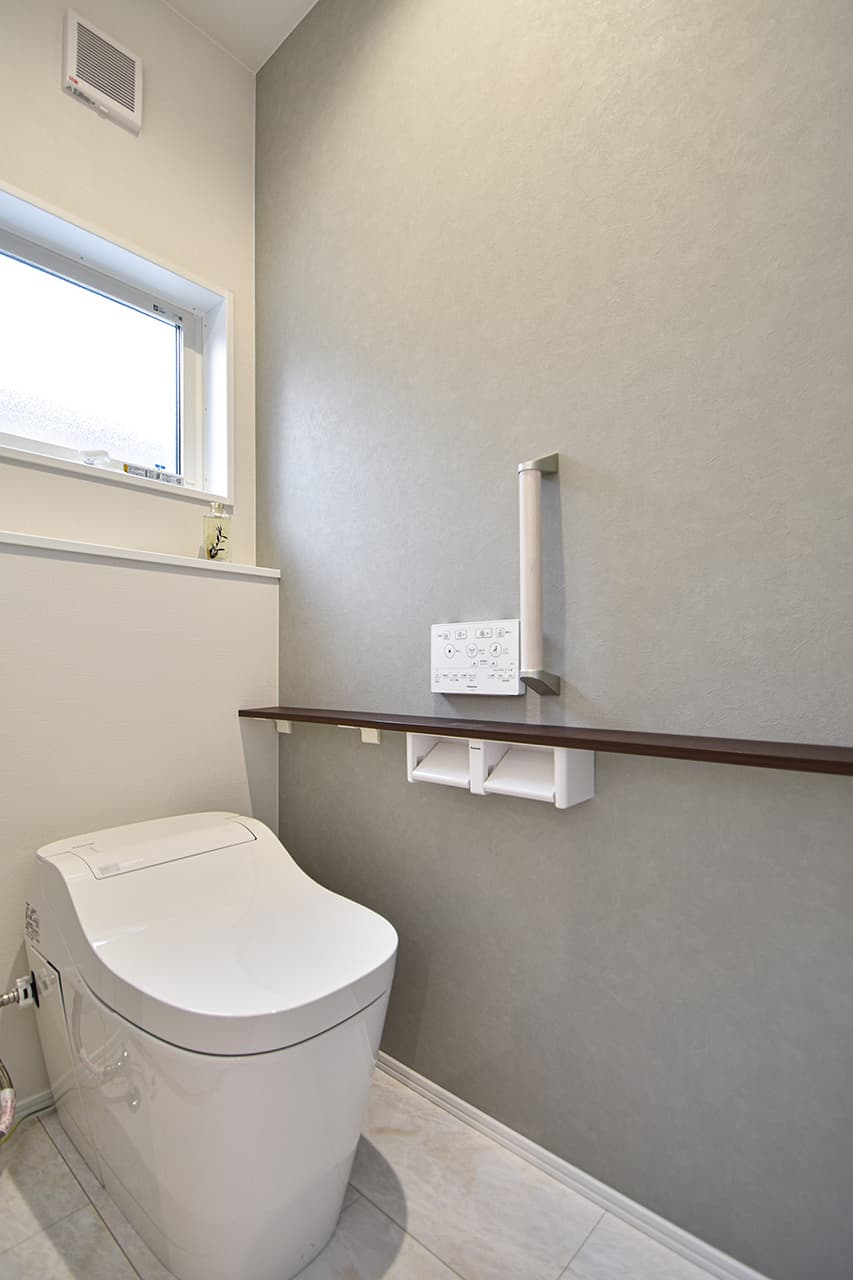 座る・立つといった動作が足腰への大きな負担をかけるトイレ。握りやすい位置に手すりを設置して、負担の軽減に配慮しています。
