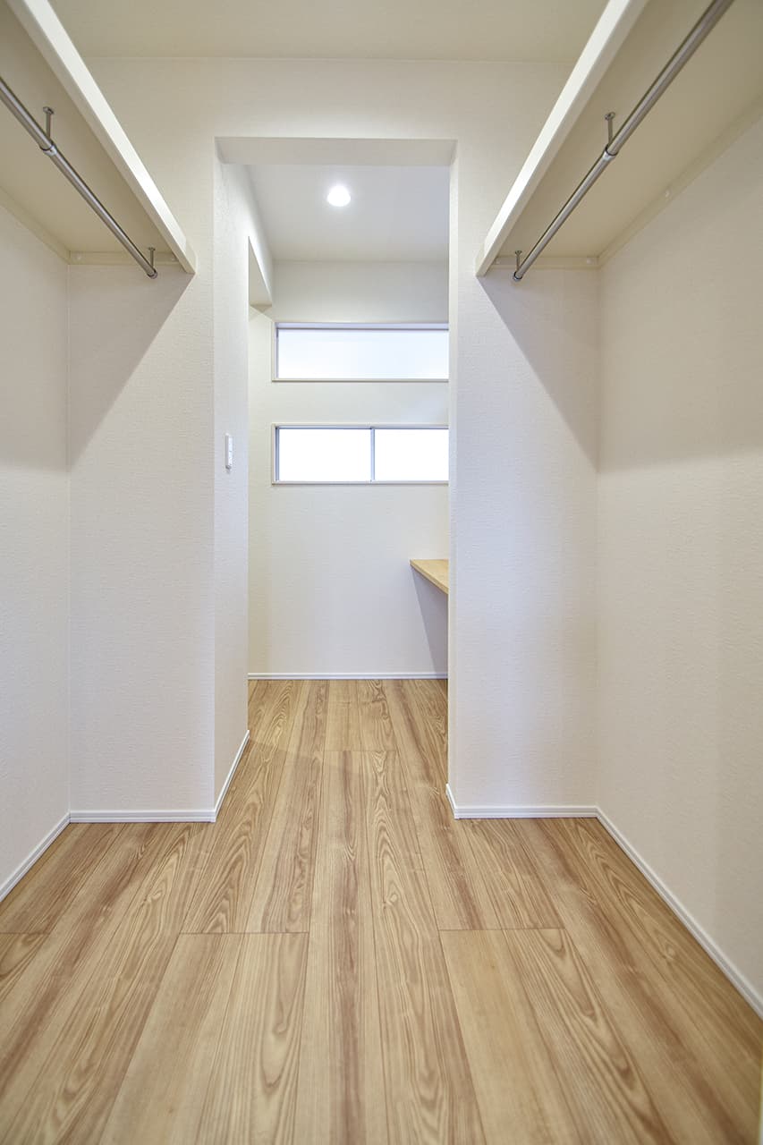 ご夫婦や子ども達の衣類をたっぷりしまえる大容量のウォークインクローゼット。季節の衣類から鞄や帽子などの小物までたっぷり保管可能。ウォークインタイプなので衣類の出し入れや整理整頓もスムーズに行えます。