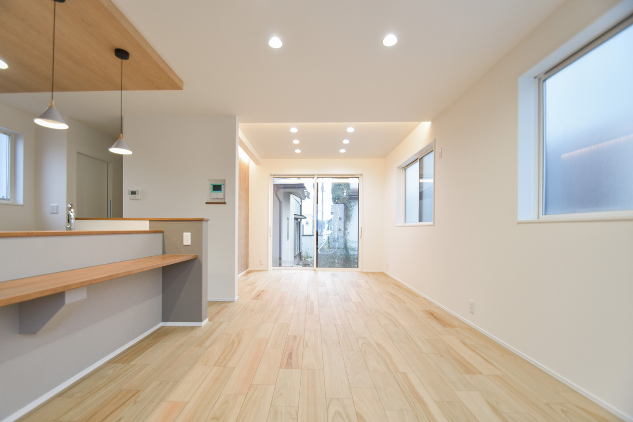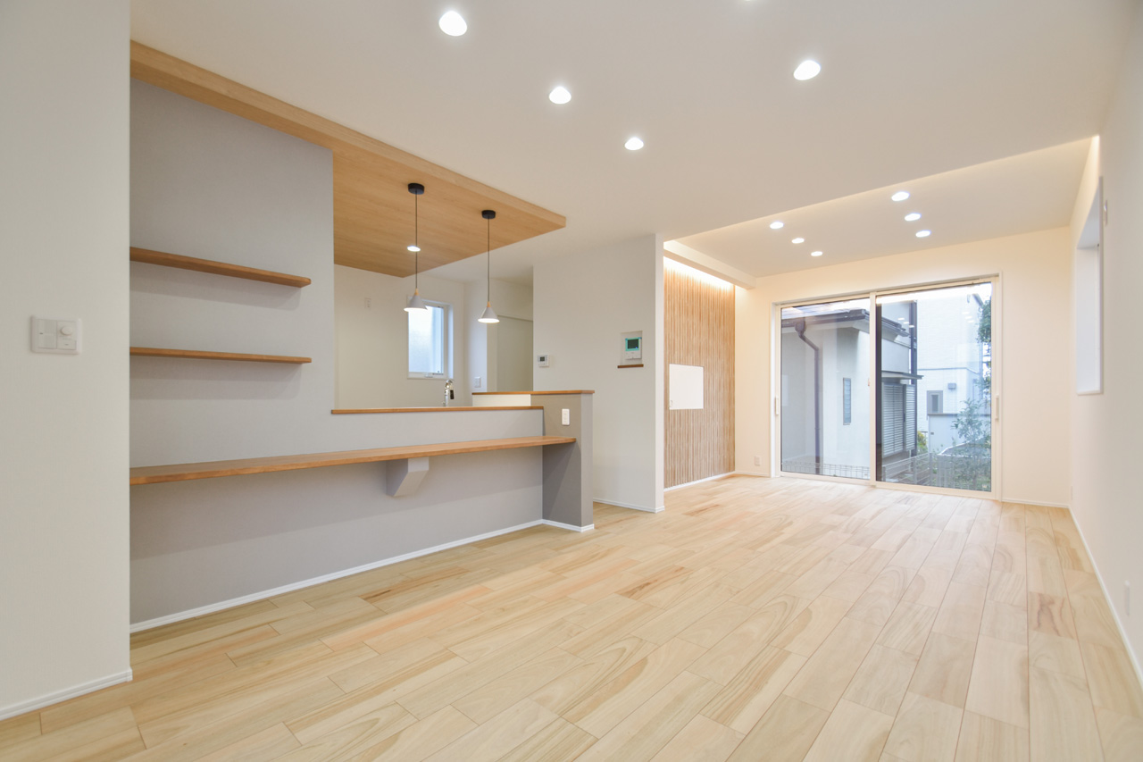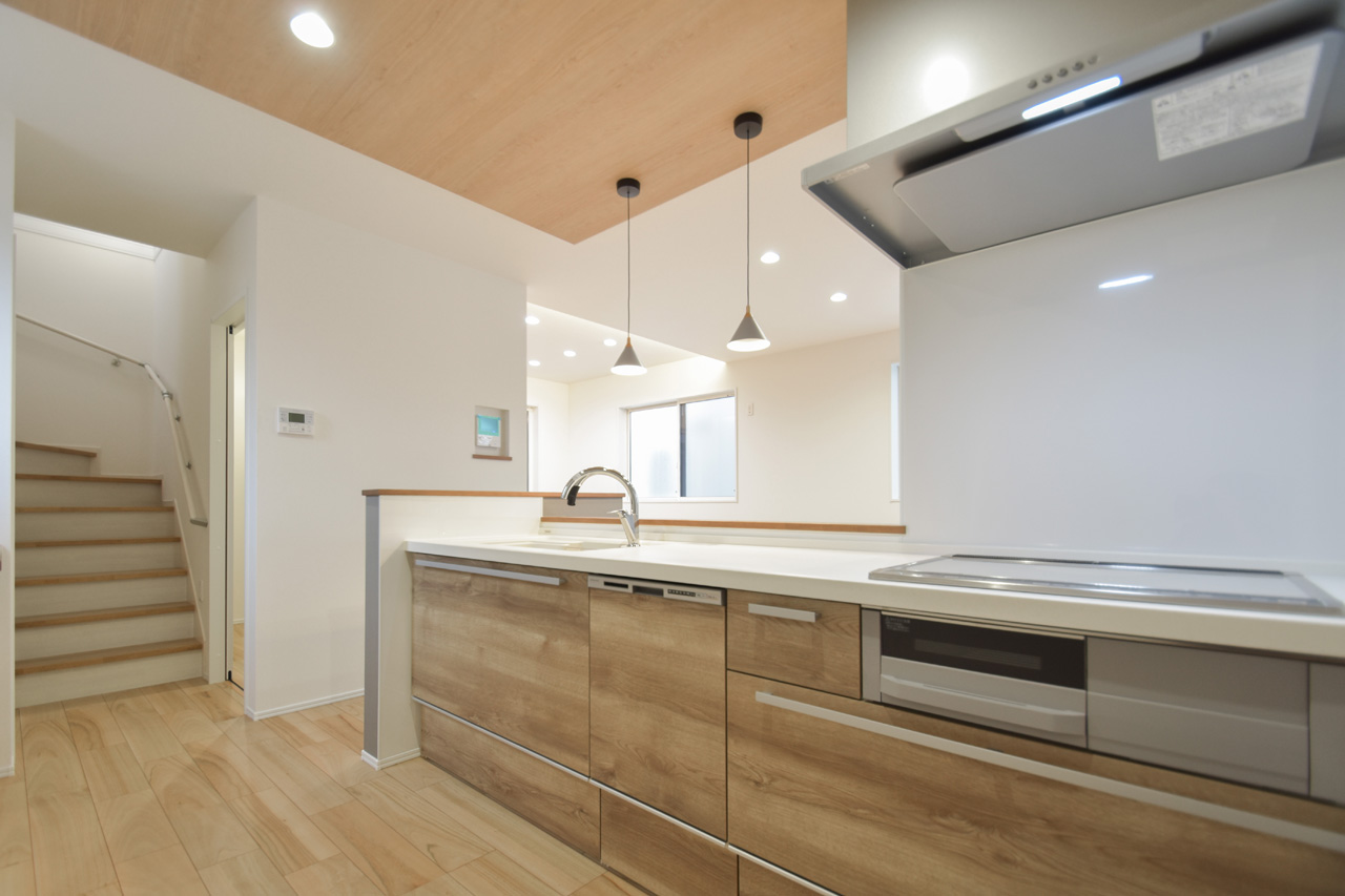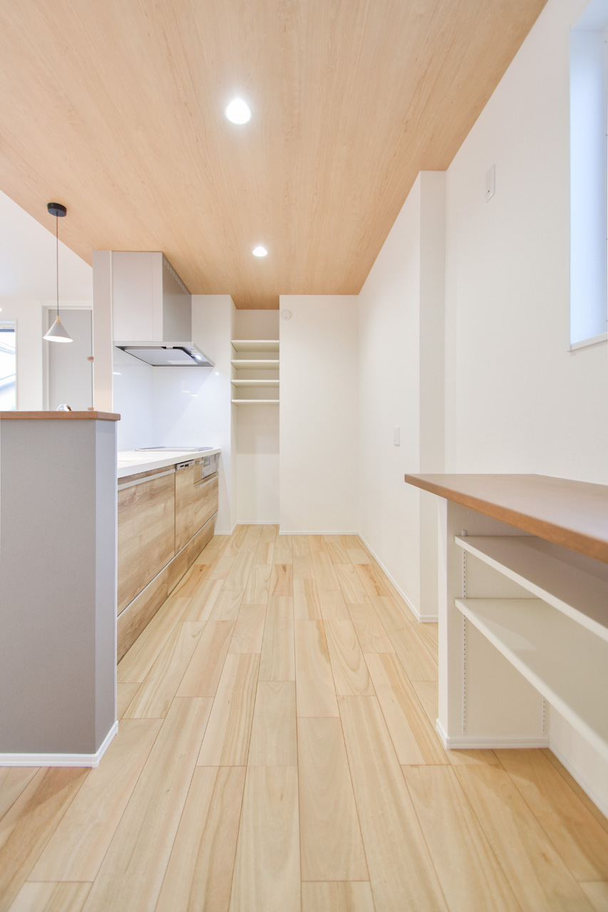 カウンターキッチンに備えた広めのカウンター。おしゃれな椅子を置くだけでおうちに居ながらCafeスペースに。平日の忙しい朝食の時間もステキに過ごせそうな空間です。