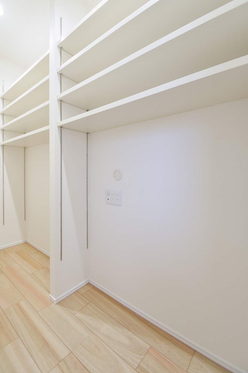 ご夫婦や子ども達の衣類をたっぷりしまえる大容量のウォークインクローゼット。季節の衣類から鞄や帽子などの小物までたっぷり保管可能。ウォークインタイプなので衣類の出し入れや整理整頓もスムーズに行えます。