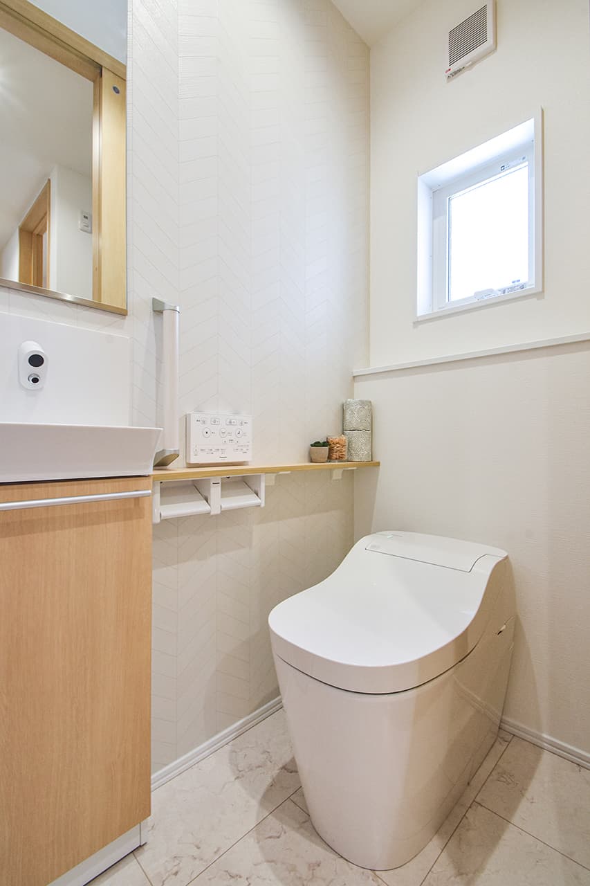 脱衣所と洗面所スペースをセパレートした独立洗面台。来客時など、あまり見せたくない洗濯機まわりを気にする事なく、洗面所を利用することができます。