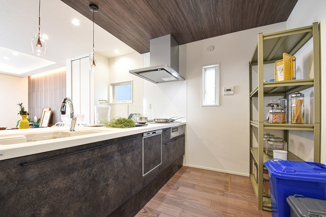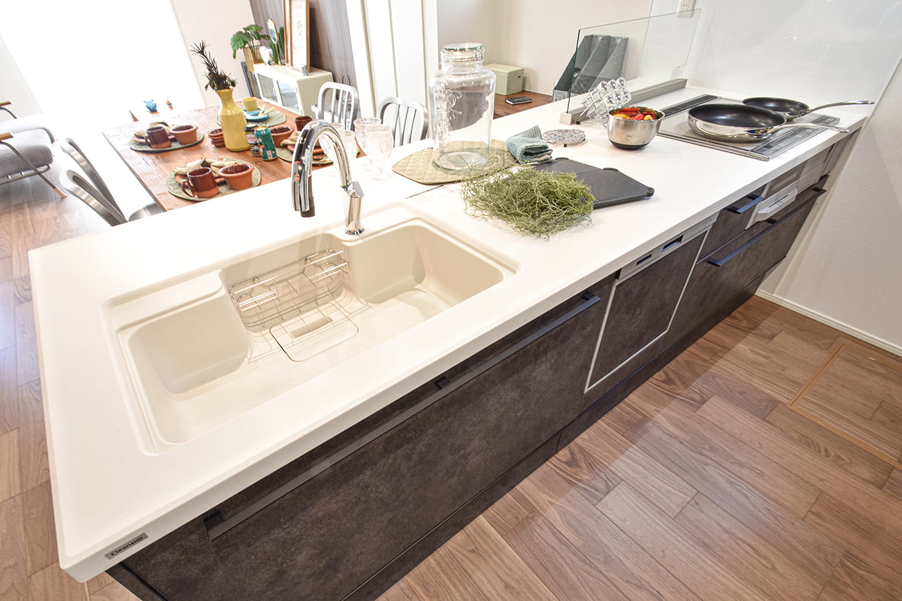 家族でのコミュニケーションがとれる対面型システムキッチンです。横一列にシンクとコンロをまとめたシンプルな形です。動きやすさとスタイリッシュなデザインが魅力です。