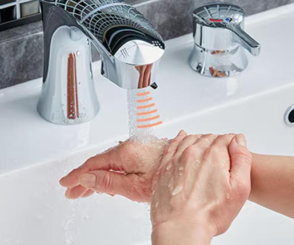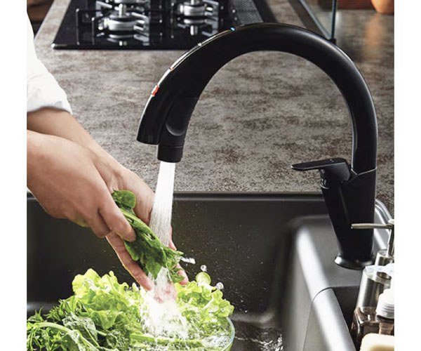 水栓に触れなくてもセンサーに手をかざすだけで吐水・止水ができます。浄水器はカートリッジの交換時期が近づくと操作パネル上でお知らせ表示。ひと目で確認できるので、見落としもなく安心です。