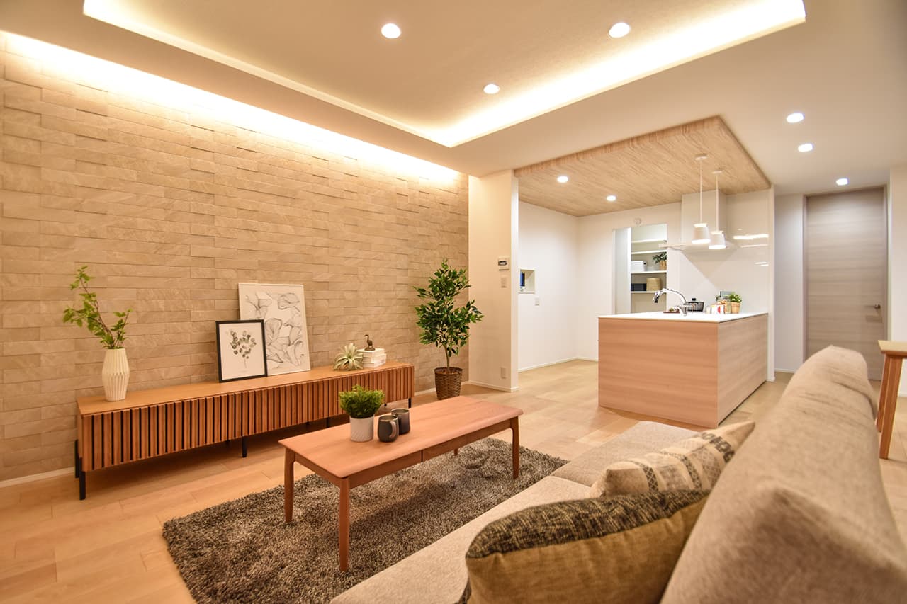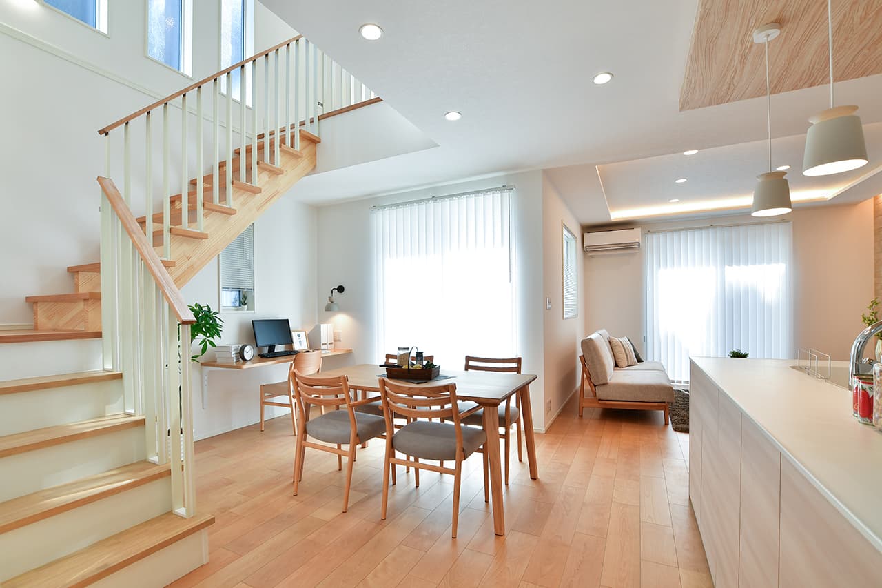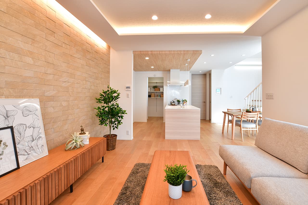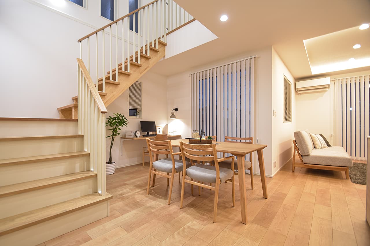 ご家族の団らんや寛ぎの中心となるリビング空間をさらに際立たせる吹抜け天井プラン。2階天井まで続くその圧倒的な存在感と広がりが訪れた方を驚きを持ってお迎えします。大切にしたいご家族やゲストをもてなす上質な空間です。