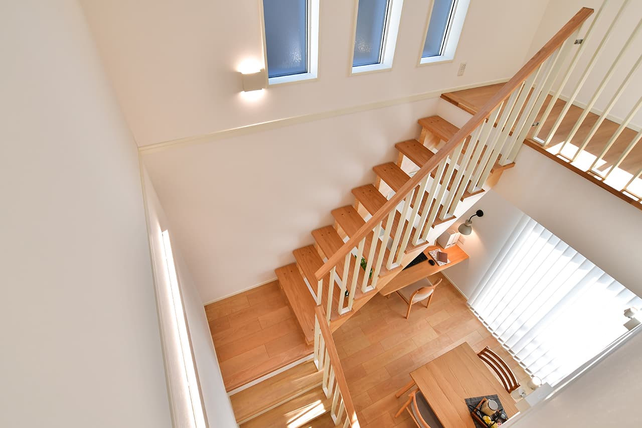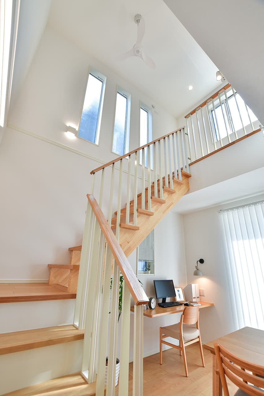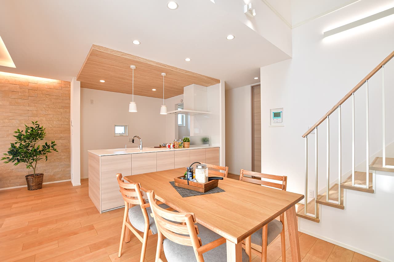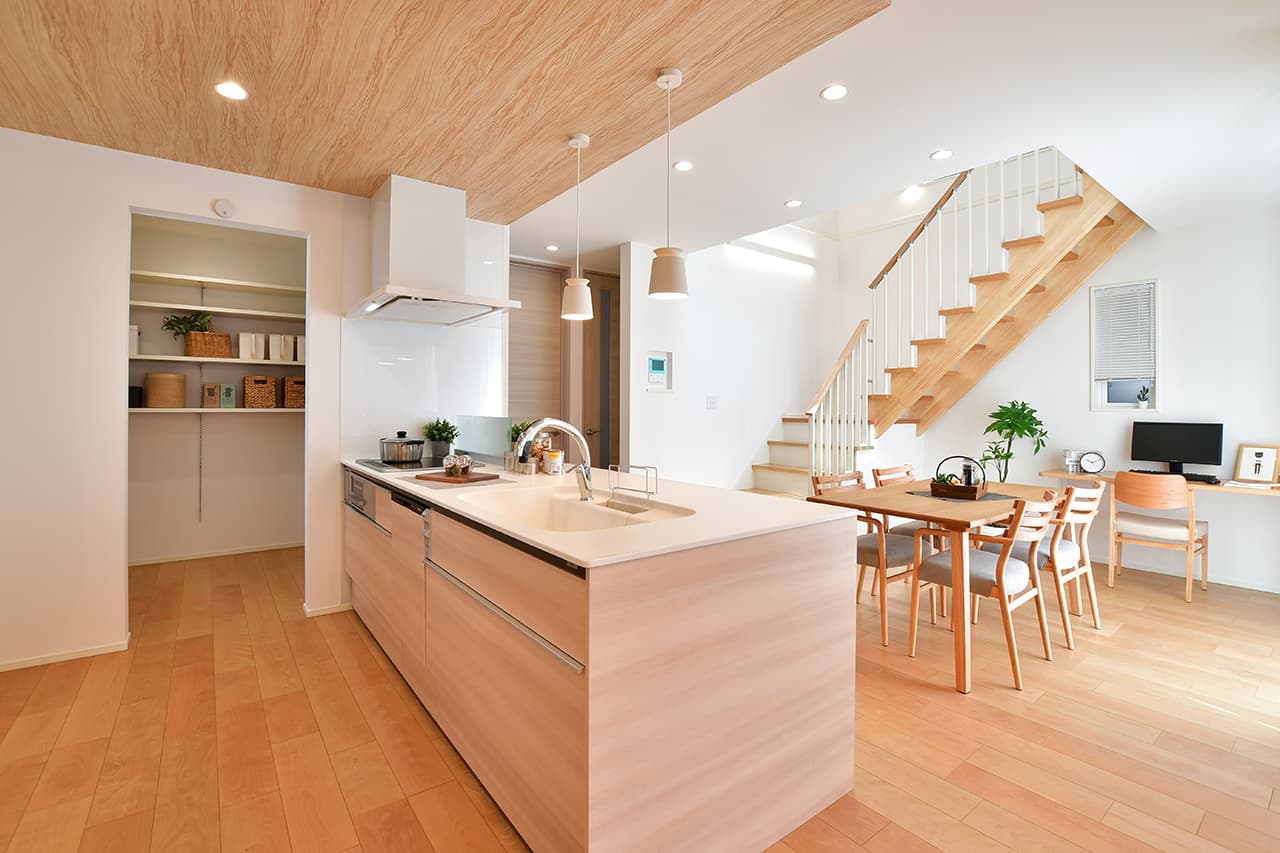 ご家族の団らんや寛ぎの中心となるリビング空間をさらに際立たせる吹抜け天井プラン。2階天井まで続くその圧倒的な存在感と広がりが訪れた方を驚きを持ってお迎えします。大切にしたいご家族やゲストをもてなす上質な空間です。