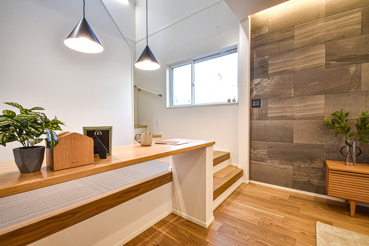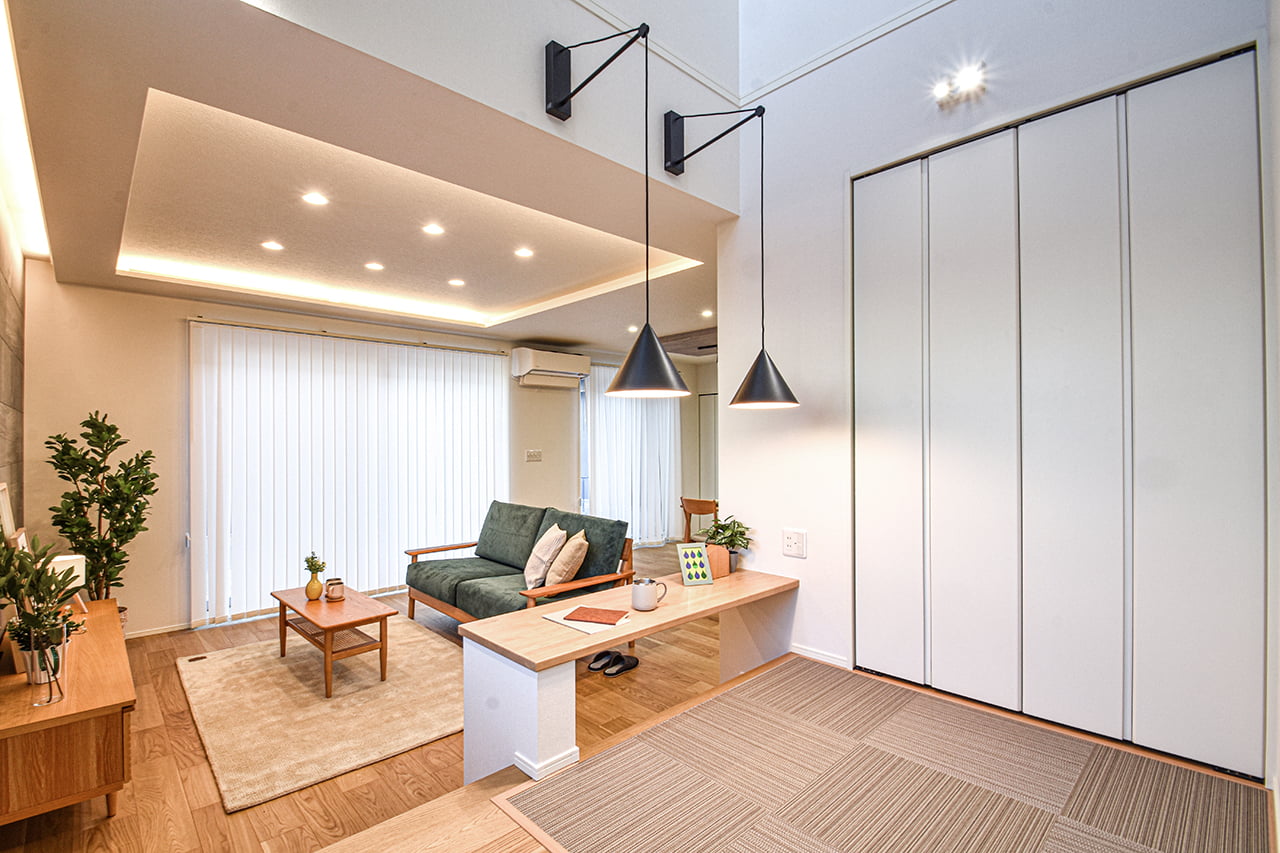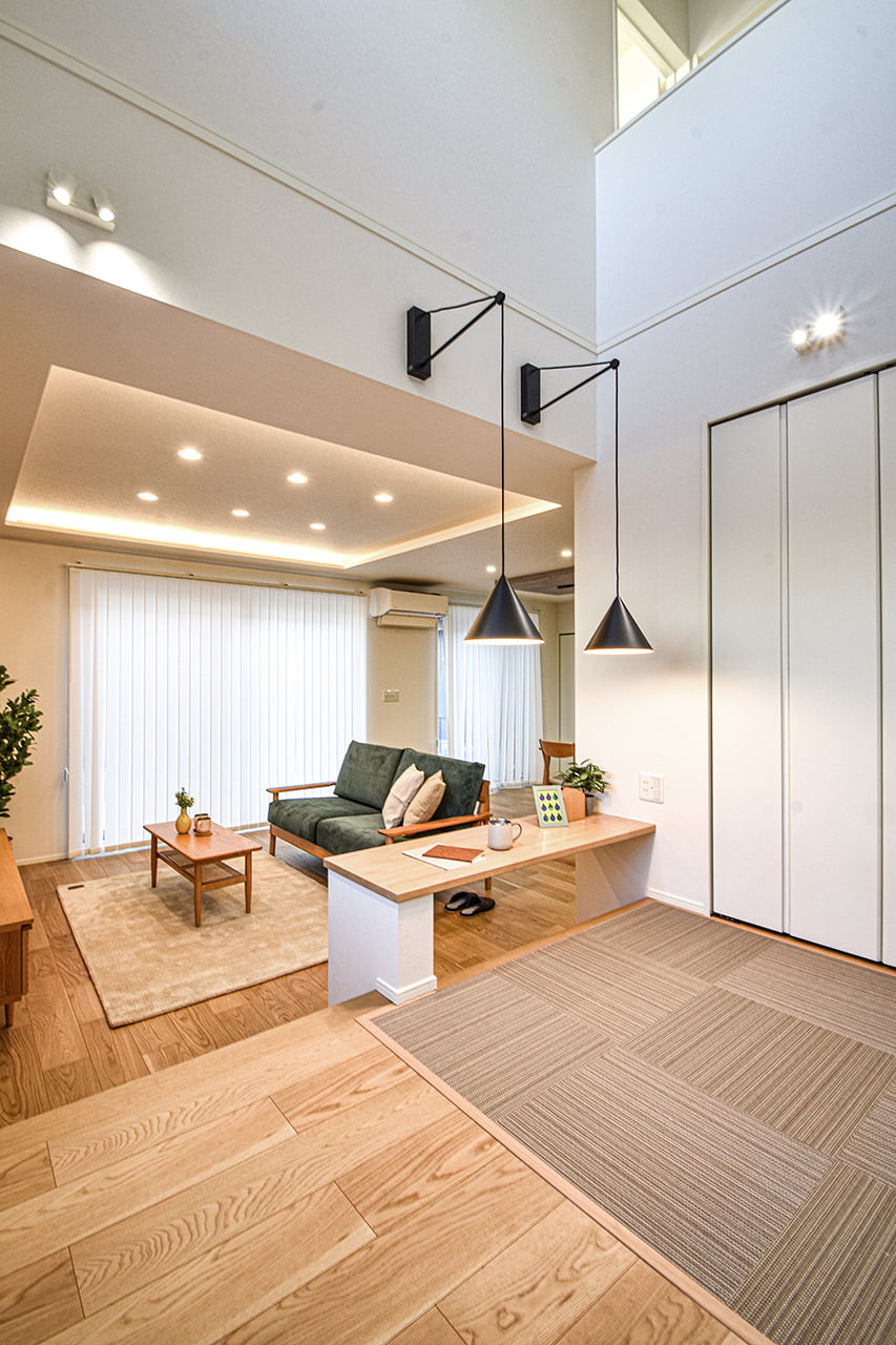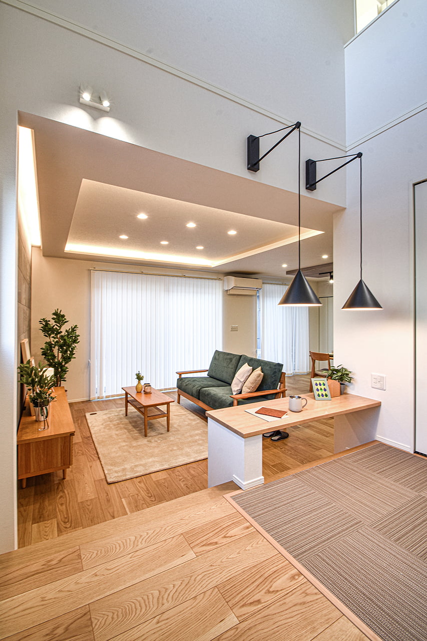 ご家族の団らんや寛ぎの中心となるリビング空間をさらに際立たせる吹抜け天井プラン。2階天井まで続くその圧倒的な存在感と広がりが訪れた方を驚きを持ってお迎えします。大切にしたいご家族やゲストをもてなす上質な空間です。