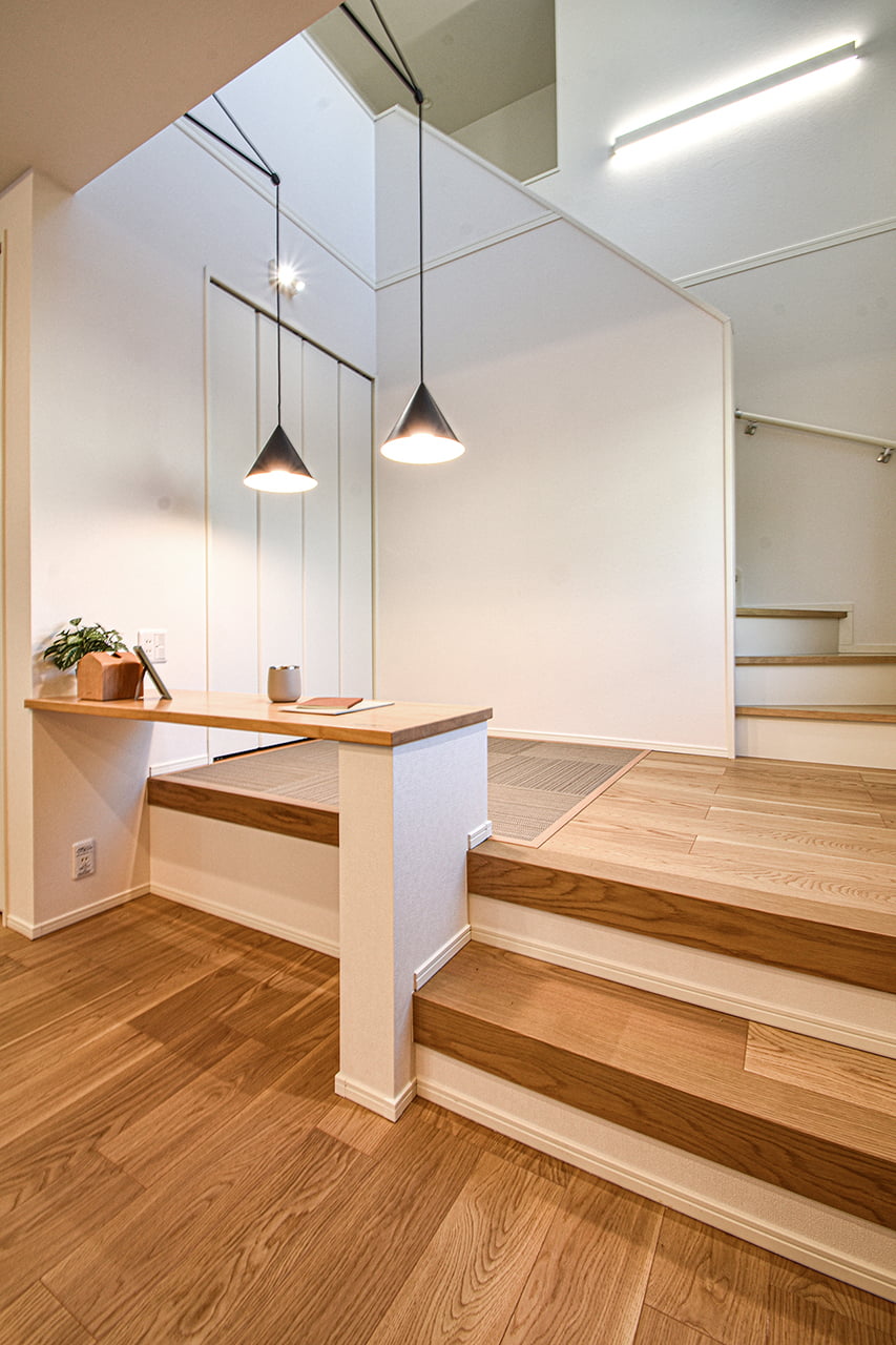 LDKにレイアウトしたカウンタースペース。子ども達の学習スペースやパパのSOHOスペース、ママのワーキングスペースなど、用途やスタイルに応じて多彩に活躍。家族のそばでみんなが利用できるライブラリー空間です。