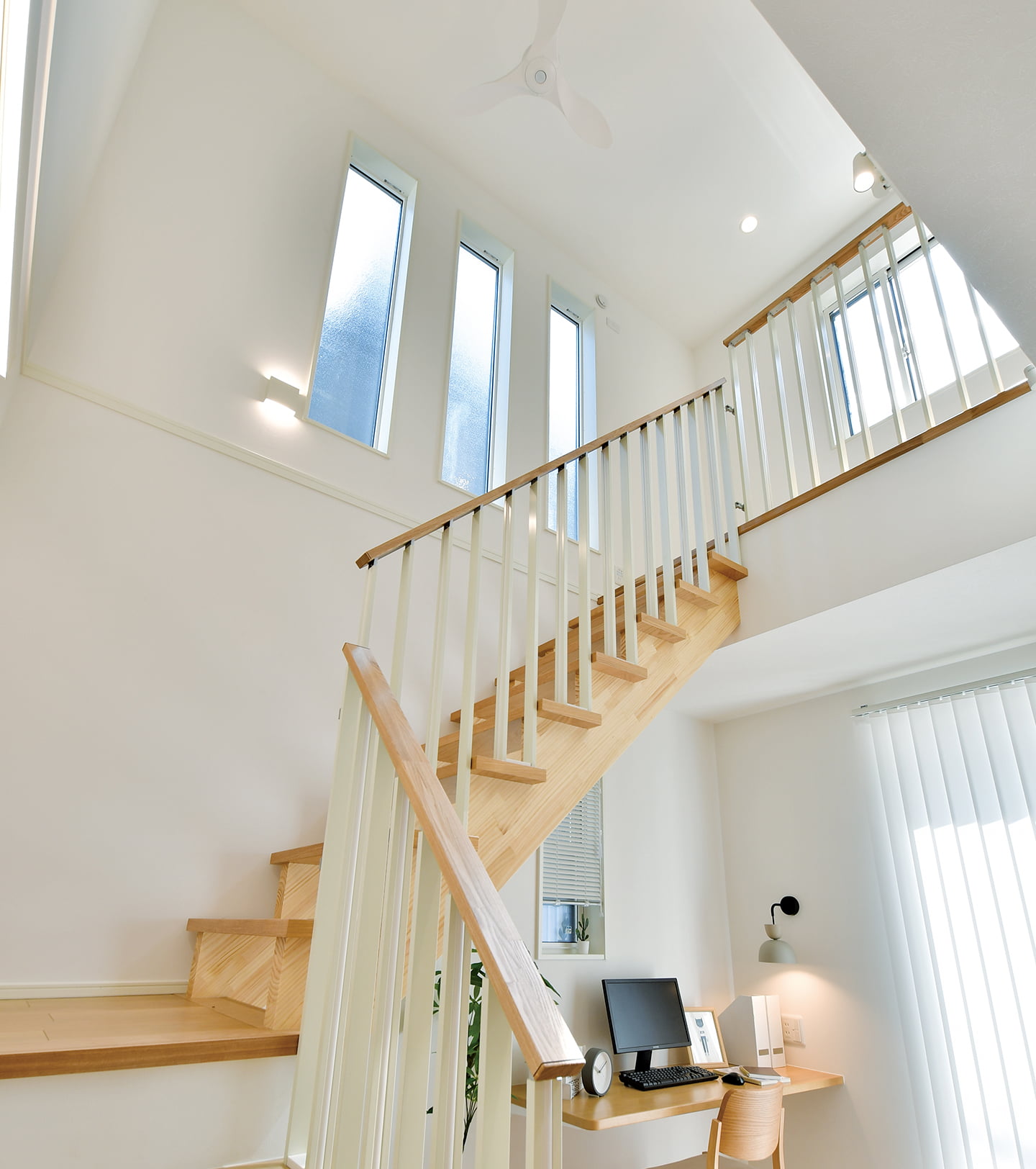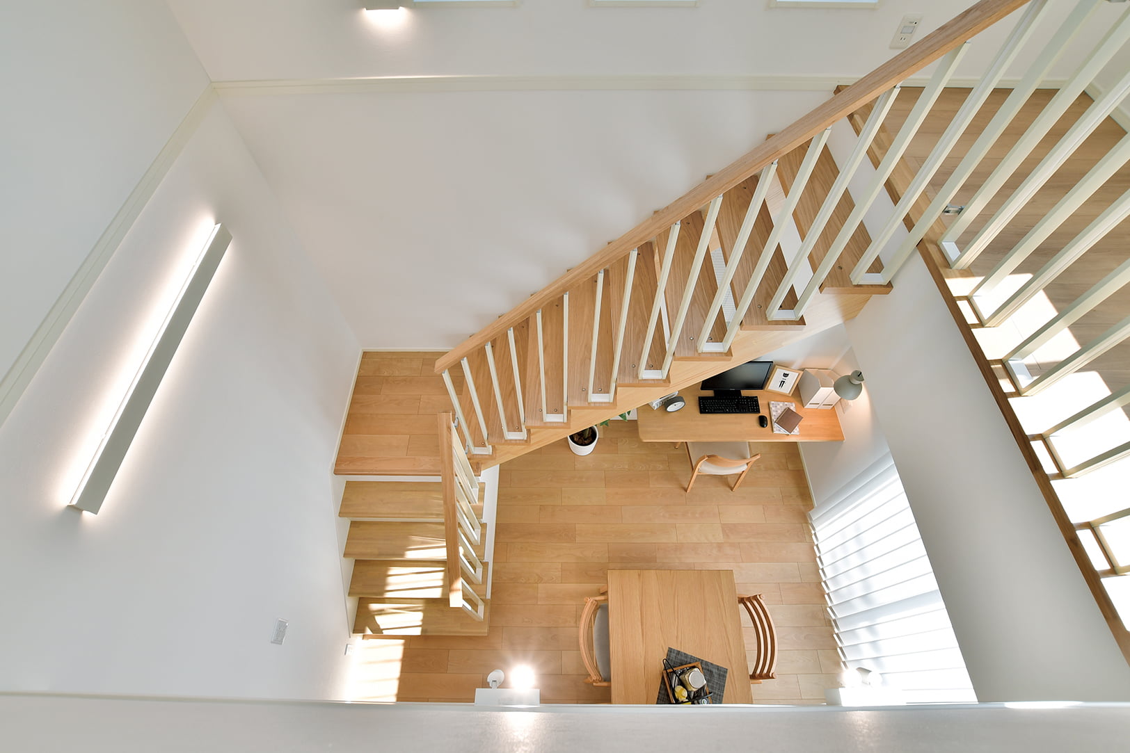空間の開放性はもとより、採光にも大きく寄与するLDKの吹抜け。オープン階段から2階ホールにかけてあしらったデザイン手すりが、視界を引き締めるスタイリッシュなアクセントに。