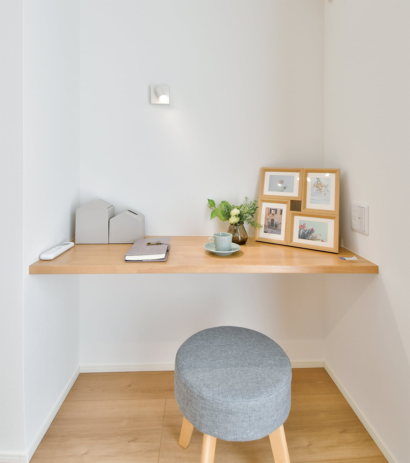 主寝室の一角に設けた書斎スペース。ビジネスのアイデアを考えるSOHO的な使い方や、お気に入りの書籍や趣味をじっくり楽しむリラックスした使い方ができる書斎スペース。自分時間を満喫できるプライベートな空間です。