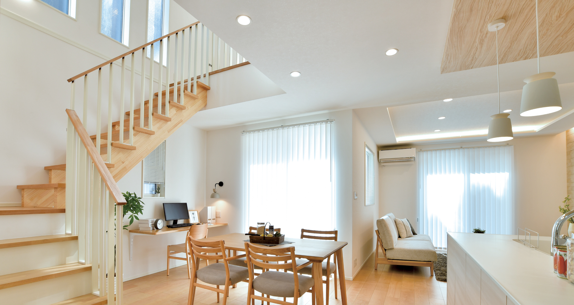ご家族の団らんや寛ぎの中心となるリビング空間をさらに際立たせる吹抜け天井プラン。2階天井まで続くその圧倒的な存在感と広がりが訪れた方を驚きを持ってお迎えします。大切にしたいご家族やゲストをもてなす上質な空間です。