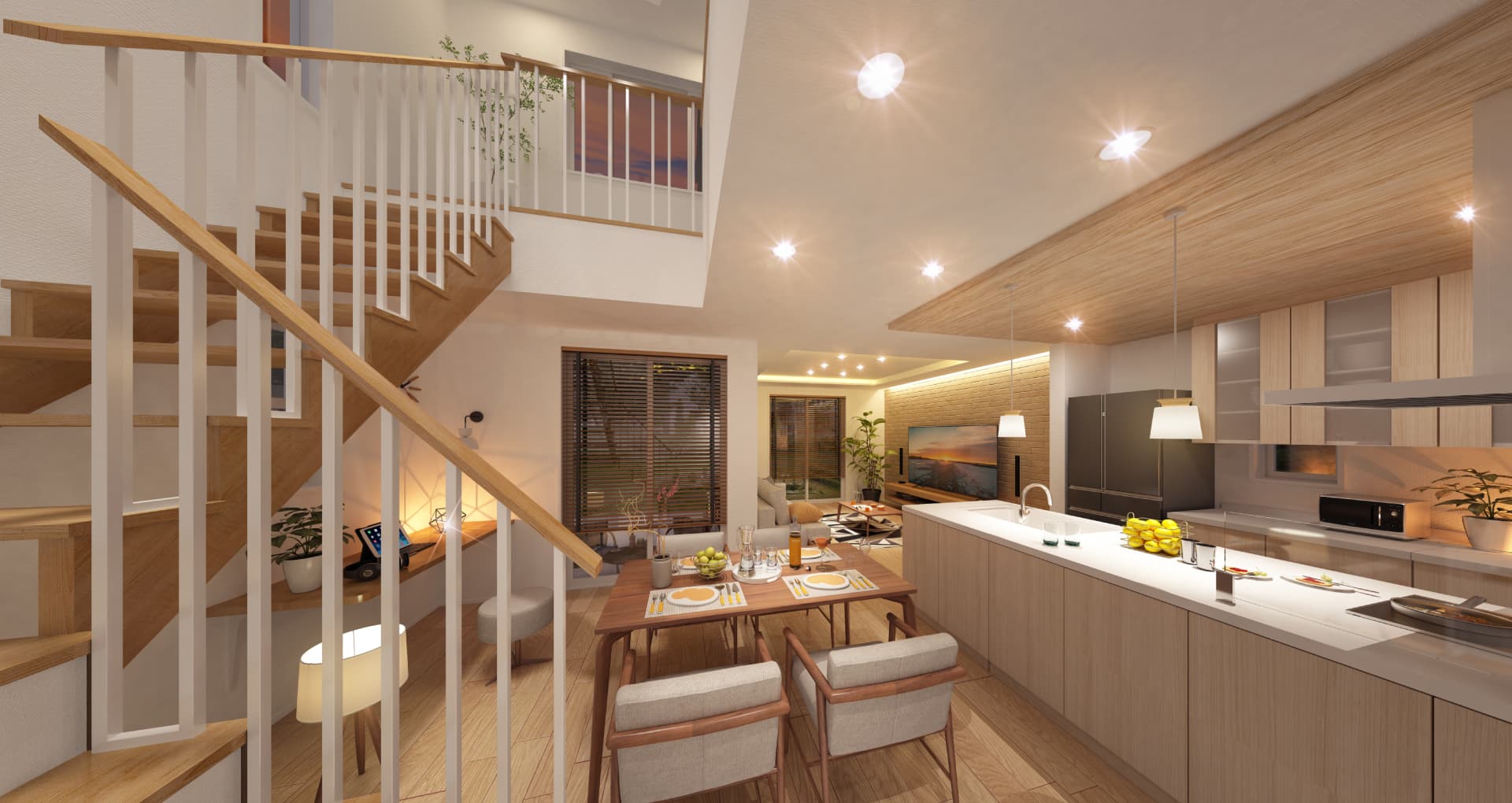 洗練されたリビングやダイニングは、吹抜けや高窓から降り注ぐ光に満ち、