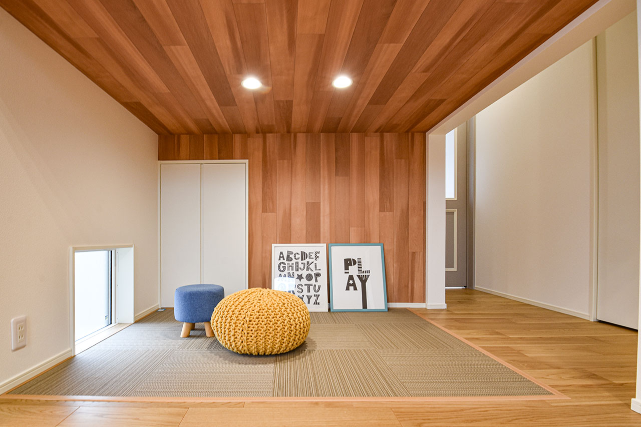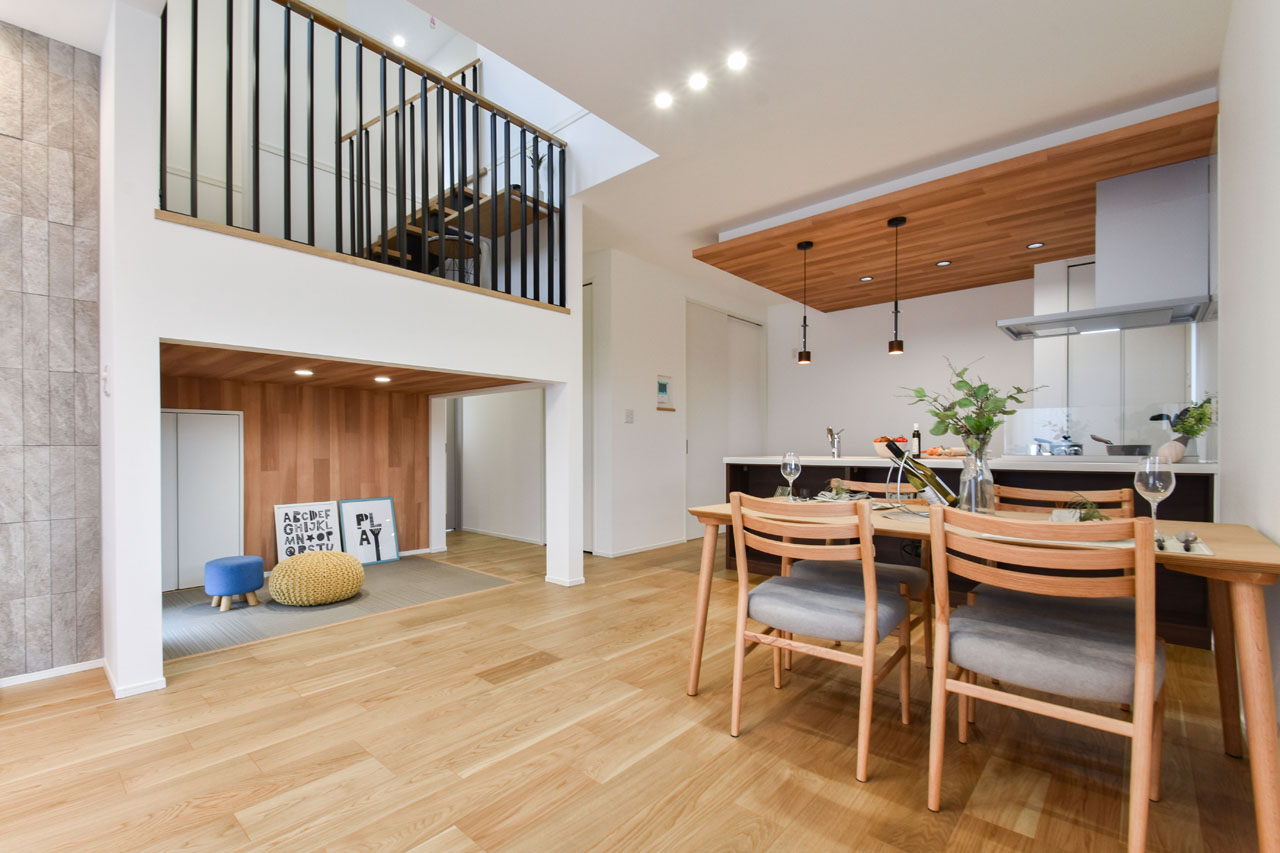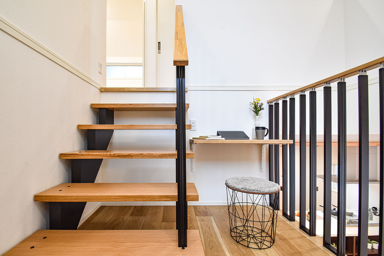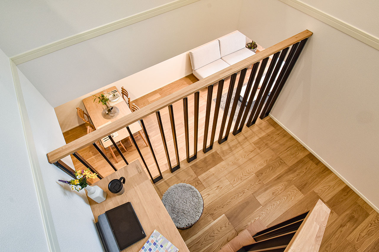 リビング階段の踊り場を利用したステージリビング。子どもが遊んだり、リビング学習をしたりと、リビングに子ども達の居場所を創るスペースです。もちろん、家族が自由に使えるスペースとして、様々なライフシーンを個性的に紡ぐアイデア空間です。