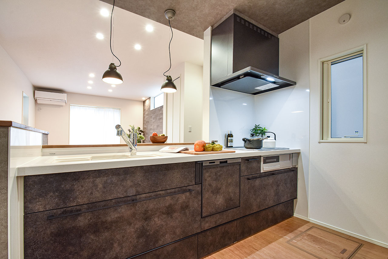 家族でのコミュニケーションがとれる対面型システムキッチンです。横一列にシンクとコンロをまとめたシンプルな形です。動きやすさとスタイリッシュなデザインが魅力です。