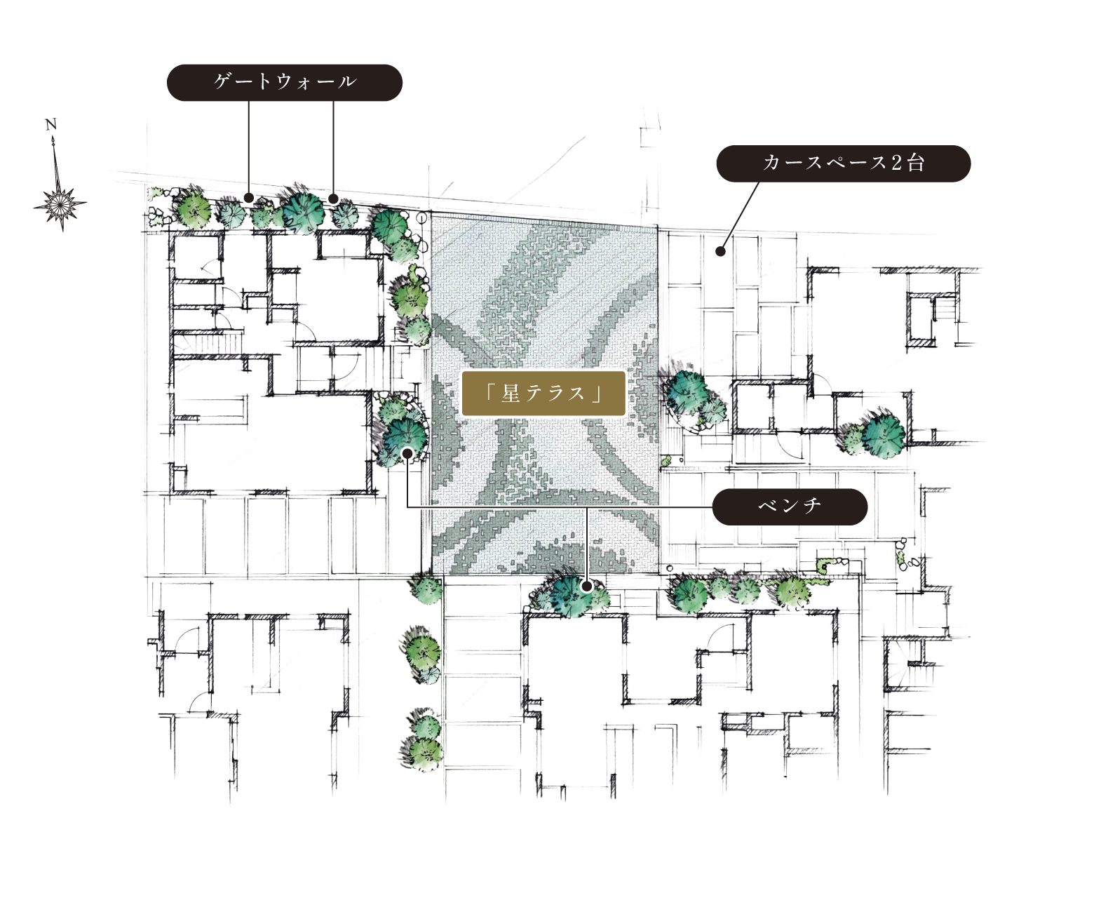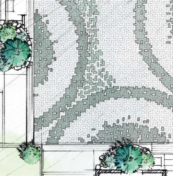 インターロッキング意匠「星テラス」の敷石には、豊かな表情で彩るインターロッキングを設えました。大堀川の水面に静かに広がる波紋を連想させる環状の意匠は、各区画の境界を曖昧にしつつ、協定道路全体が流山の自然と調和した景観を演出しています。