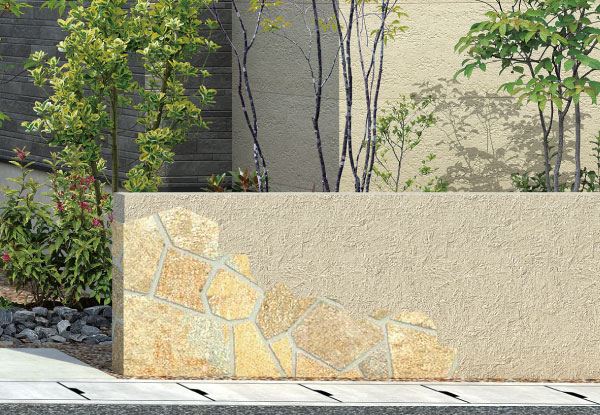 御影石のゲートウォール自然な風合いを醸し出す、御影石の乱形貼りを施したゲートを、街の入口に設えました。趣のある佇まいが、人々を優しく迎え入れます。
