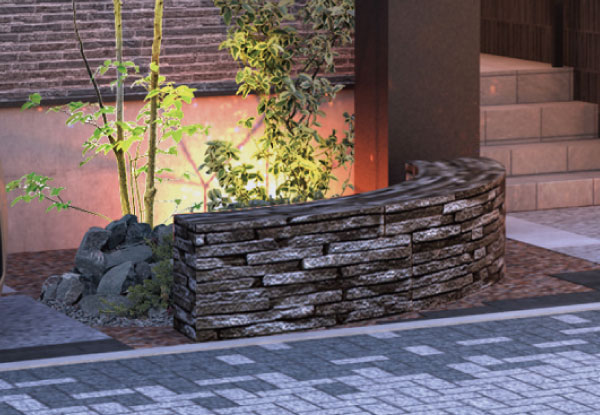 鉄平石小端積みのベンチ協定道路に面した外構の一部には、鉄平石小端積みのベンチをご用意しました。気軽に腰をかけて街並みを眺めたり、住人どうしで会話を楽しむことができます。