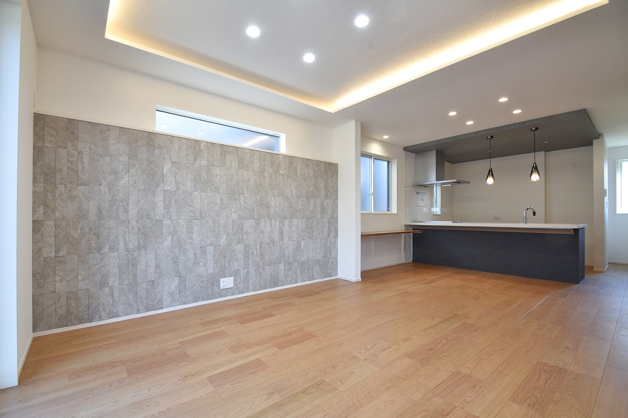 LDKにレイアウトしたカウンタースペース。子ども達の学習スペースやパパのSOHOスペース、ママのワーキングスペースなど、用途やスタイルに応じて多彩に活躍。家族のそばでみんなが利用できるライブラリー空間です。